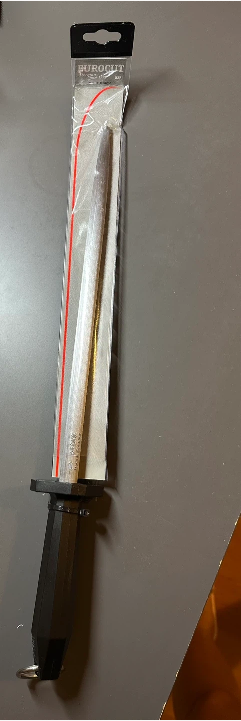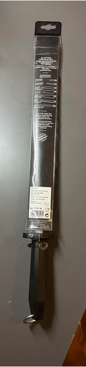 Selling a 99% new F. Dick Eurocut Sharpening Steel! Still in its original packaging, the steel is new but packing was cut opened. This sharpening steel is perfect for keeping your knives in top condition. It's made in Germany and made of fine carving steel and is a standard size.
