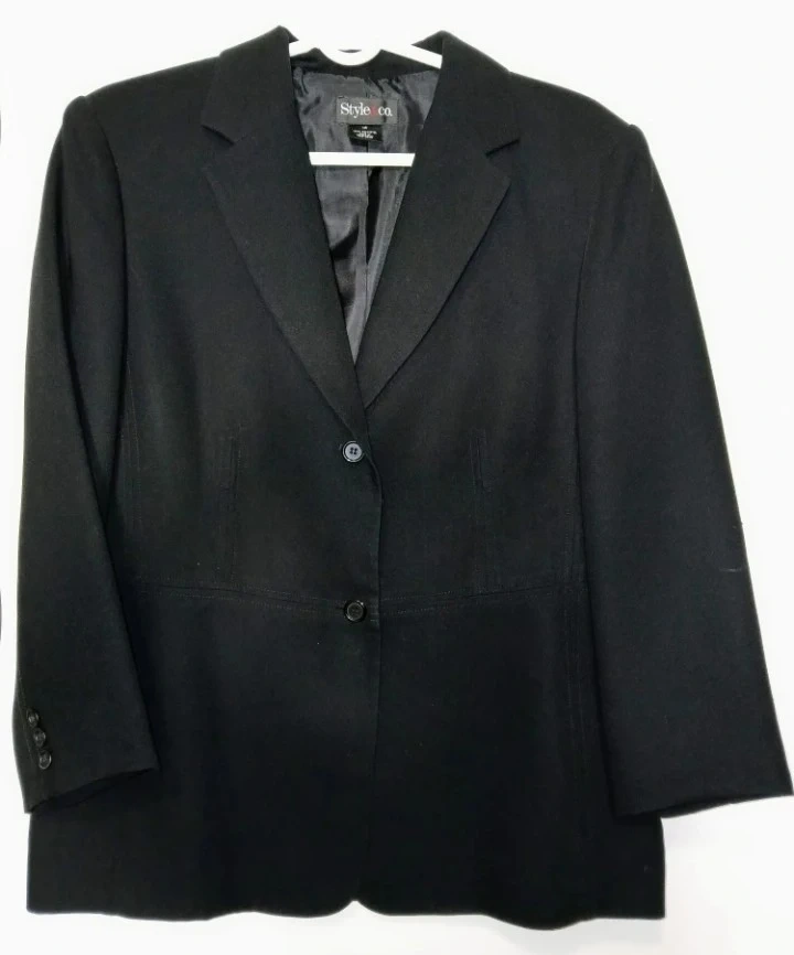 1000+Selling a black blazer from Style&co. It's in great condition and perfect for adding a touch of sophistication to any outfit! The blazer features a classic two-button closure and a sleek, tailored fit