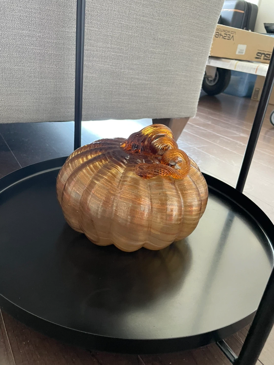 This is a beautiful decorative glass pumpkin. It would look great as a centrepiece or as part of a fall display. The colour is a lovely amber with gold glitter accents. It's in great condition!