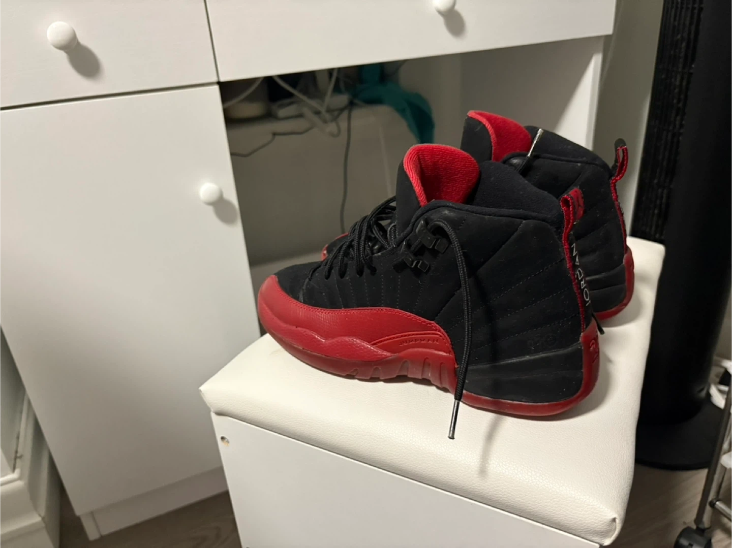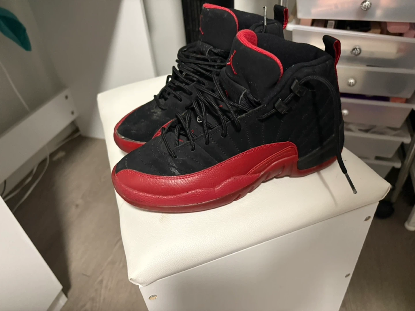 78Selling a pair of Air Jordan 12 Retro sneakers in black and red. They are size 5.5. There are some signs of wear, but they are still in good condition. Perfect for basketball or casual wear!