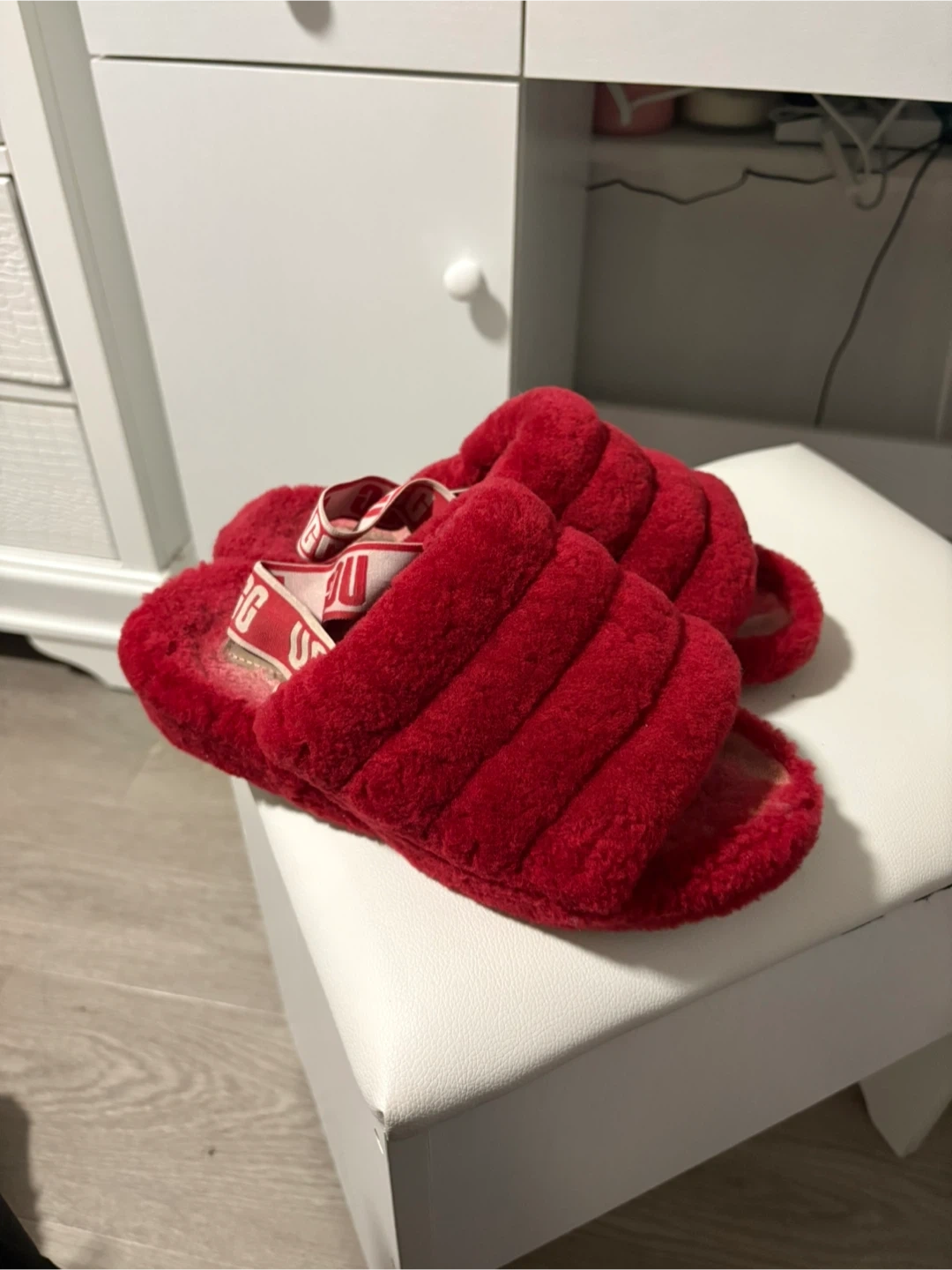 Selling a pair of red UGG Fluff Yeah slides. They are super comfy and stylish for indoor or outdoor wear. Great for adding a pop of color to your outfit!