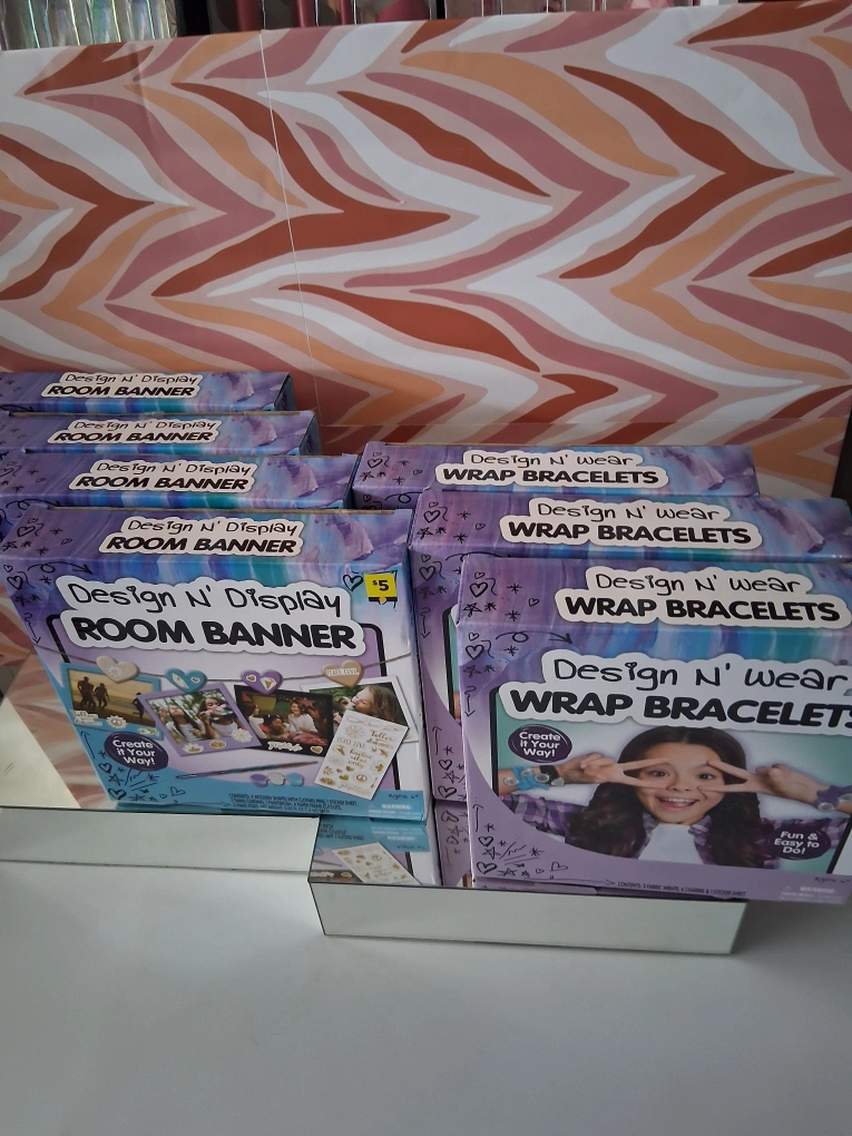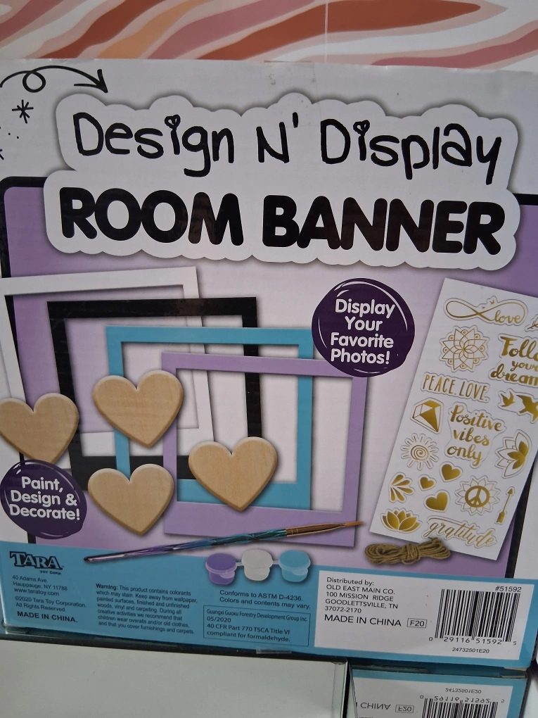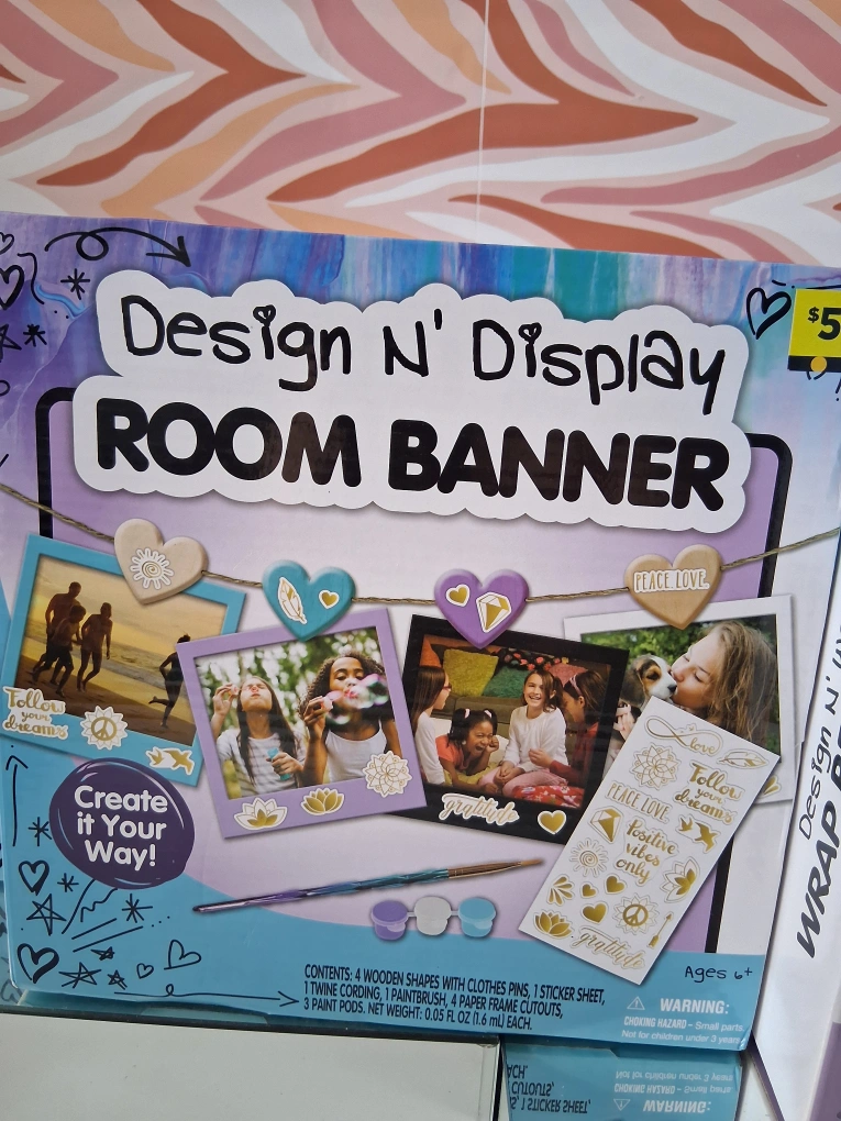 147I have a new Design N' Display Room Banner kit. The kit includes wooden shapes with clothes pins, twine cording, a paintbrush, paper frame cutouts, and paint pods. It's a fun way to display your favorite photos! $3.00 EACH.