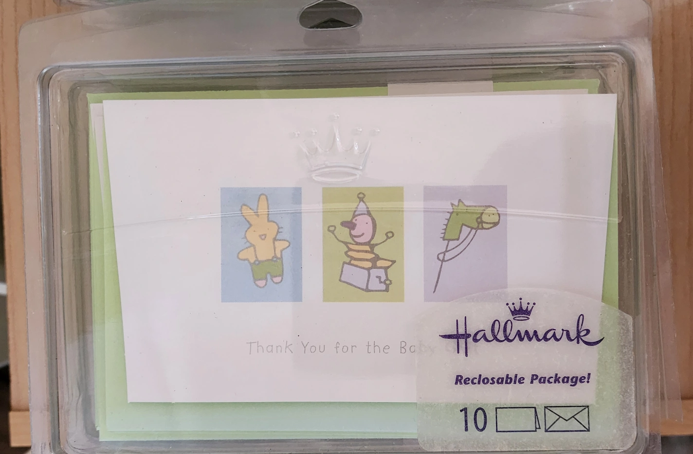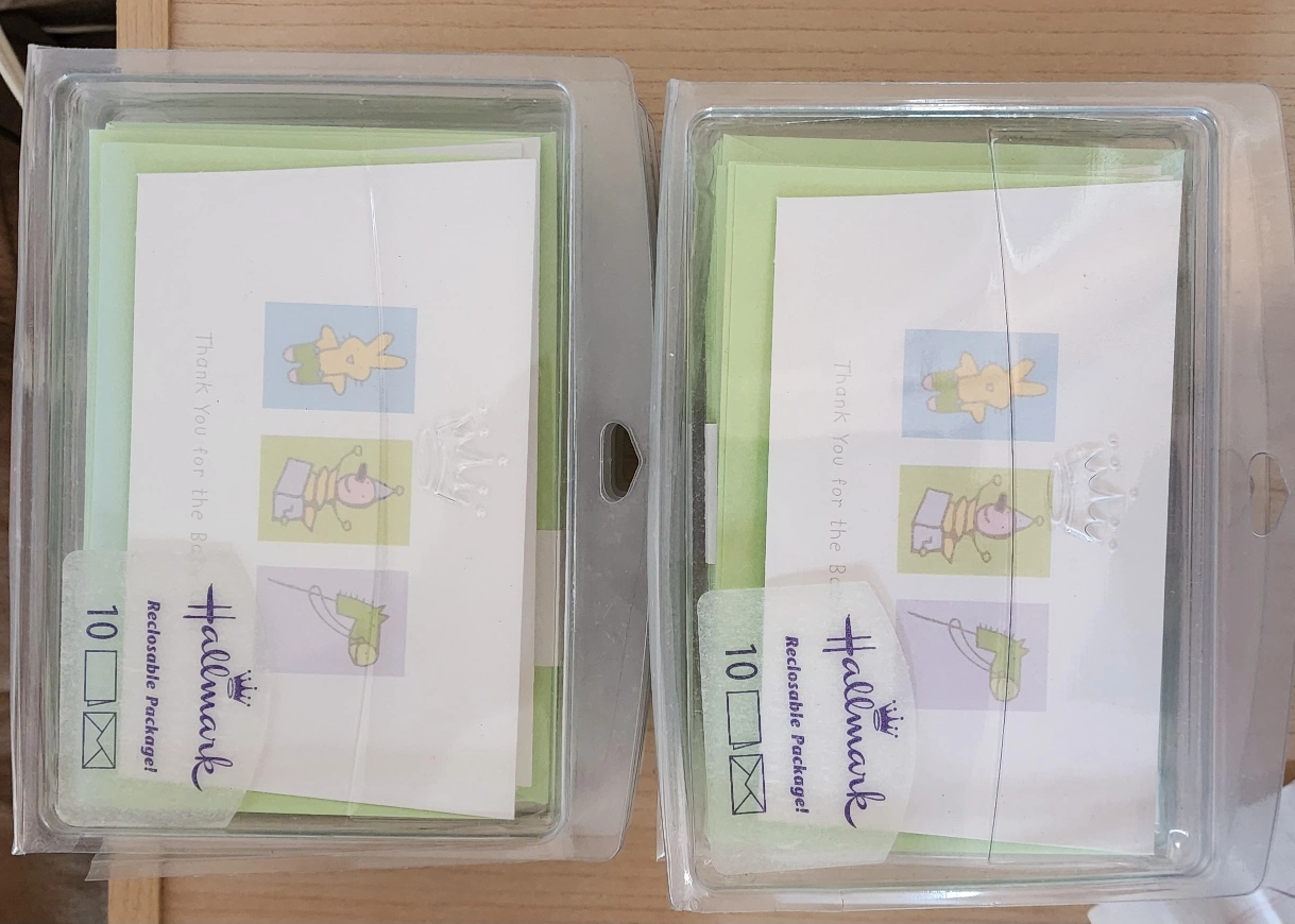 I'm selling a set of Hallmark thank you cards for baby gifts. They are new and come in a reclosable package. Each package contains 10 cards and envelopes. I have 8 packages. PU@2121 N KEELER