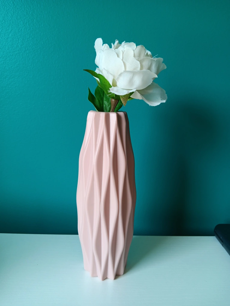 A beautiful light pink vase with a geometric design. It's in great condition and ready to add a touch of elegance to your home