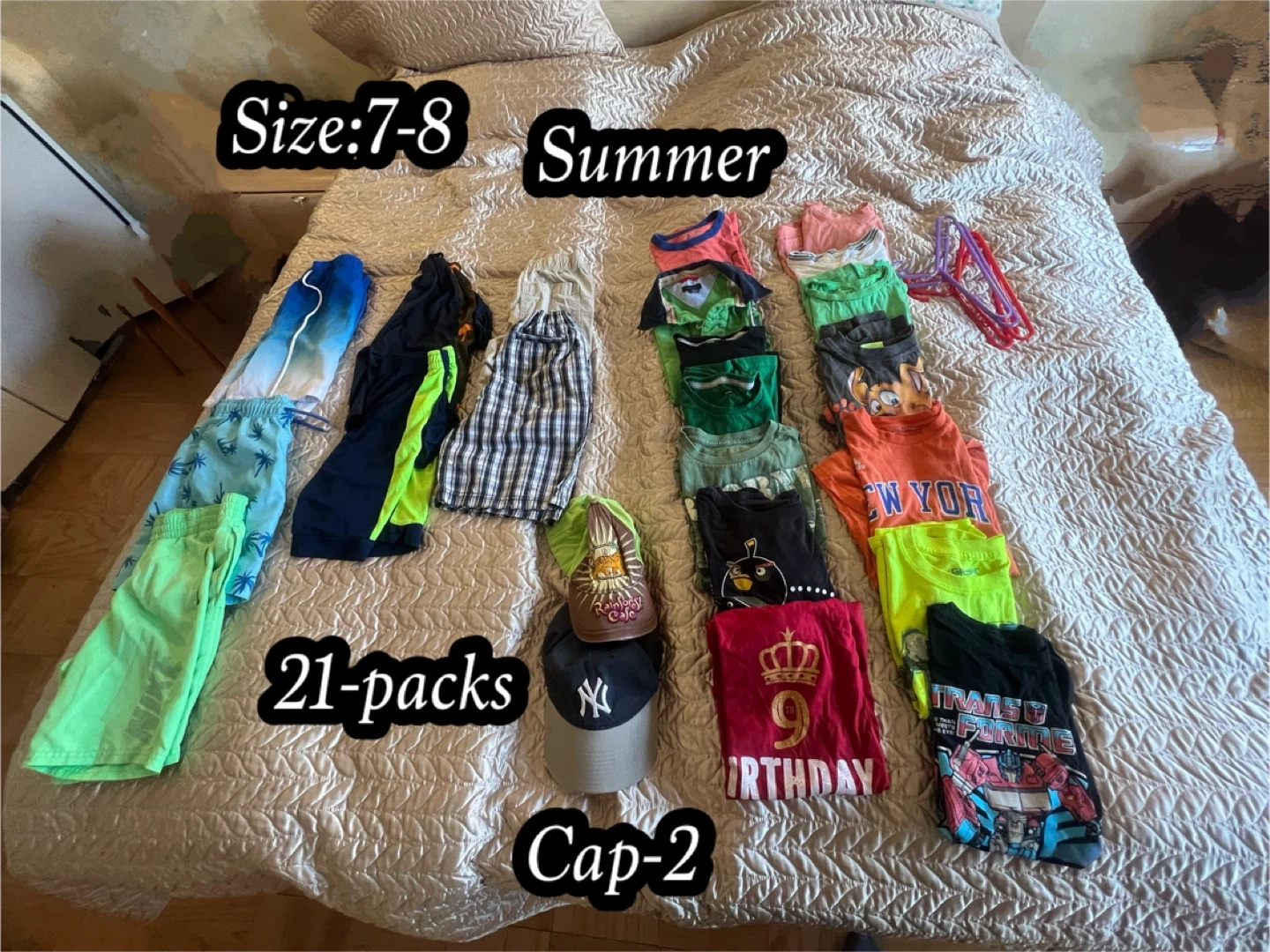 Selling a bundle of kids' summer clothes, size 7-8! This includes a variety of shirts, shorts, and two caps. Perfect for the summer season!