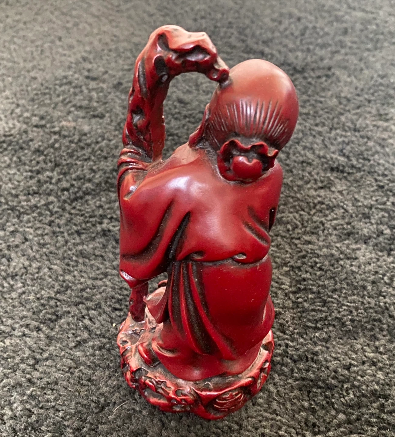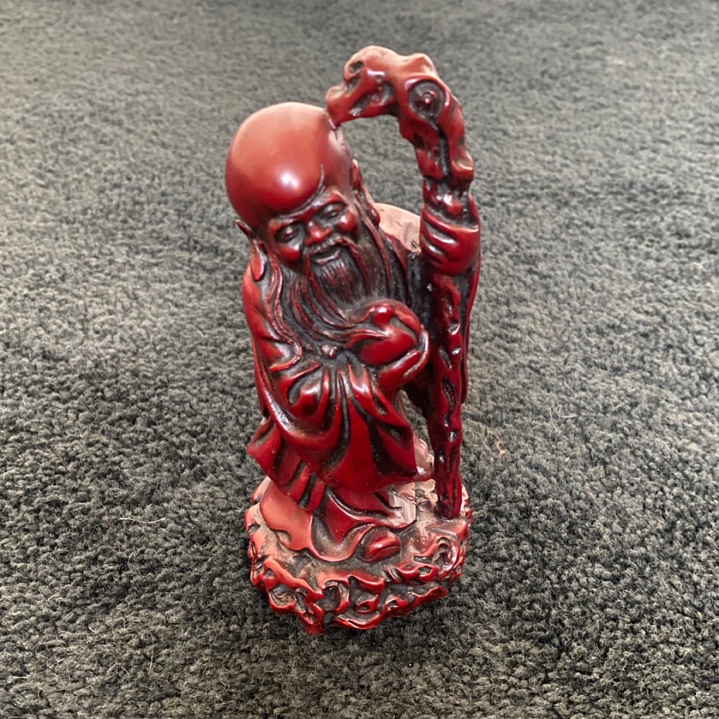 The figure depicted in the almost 6” statue is a wise man or immortal, a common subject in Chinese art and folklore associated with figures like Confucius or other revered individuals in Chinese tradition. He is believed to be Shouxing one of the three stellar deities of happiness, wealth, and longevity (Fu-Lu-Shou san xing) in Chinese mythology. He is portrayed as an old man with a prominent forehead, a long beard, and a staff. Symbolism: He is holding a peach, which symbolizes immortality, and a staff, often adorned with a gourd or other symbols of longevity. The peach is associated with the Queen Mother of the West's peaches of immortality. The vibrant red hue is carved from cinnabar or a similar colored resin, is considered a symbol of prosperity and good fortune in Chinese culture.