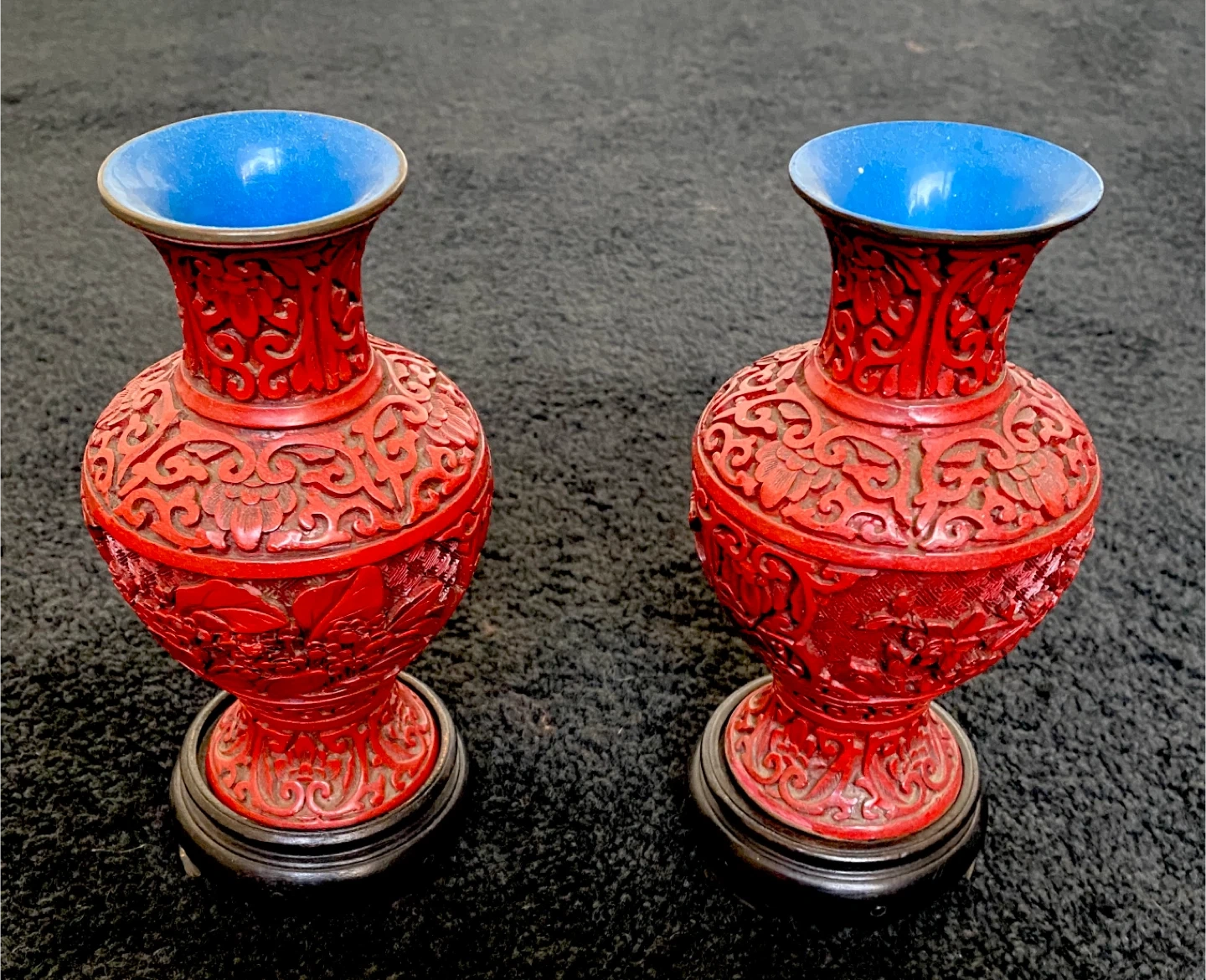 Vintage Cinnabar Chrysanthemum Vases: Crimson Red Lacquer over Blue Enamel The name "cinnabar" is believed to derive from an Eastern Indian phrase meaning "dragon's blood," alluding to its vivid red hue. Symbolic Meanings (especially in Chinese culture): Vitality and Prosperity: Its bold red color is associated with vitality, victory, and prosperity, with red symbolizing the sun, fire, royalty, and energy in Chinese culture. Spiritual Properties: In some cultures, particularly in Buddhist traditions, cinnabar is believed to possess mystical and spiritual properties, including attracting good luck, money, and prosperity, stabilizing emotions, and guarding against evil. Duality: It is also associated with the duality of life and death, and its refinement process symbolized the search for immortality in alchemy due to its connection with mercury