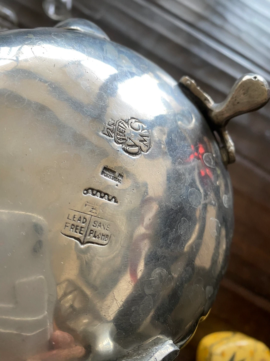 PROVENANCE was originally purchased in Saks 5th Avenue back in the day. Signed/stamped GREAT CONDITION with gorgeous luster in tact, but consistent with age and use of an antique of this caliber RARE (as in you truly can’t find it anywhere else, but here on Karrot) fluted design pattern with a Gothic flair. 4 pieces as shown. Pure Portugal Pewter with wooden scrolled handles on Teapot Tea Pot OCL Pineapple Finial 9.5"