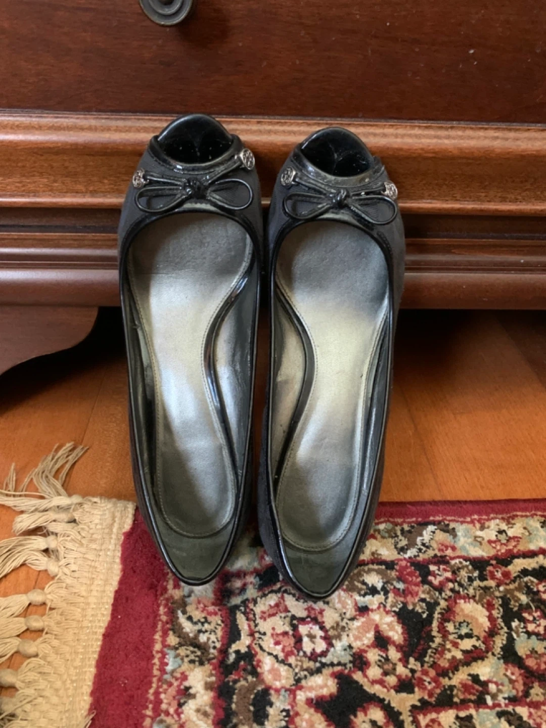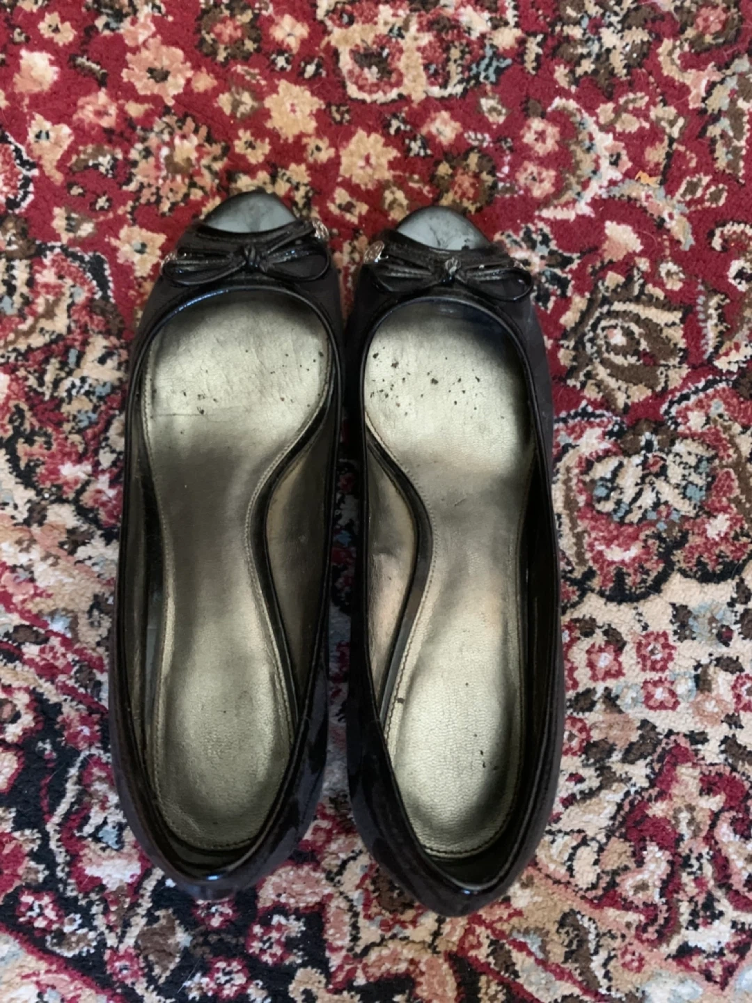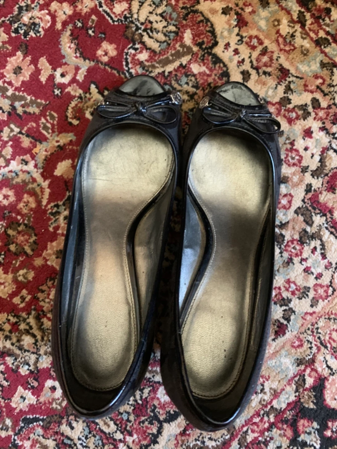 These are a pair of black wedge shoes, have a bow detail on the front. They are in used condition.