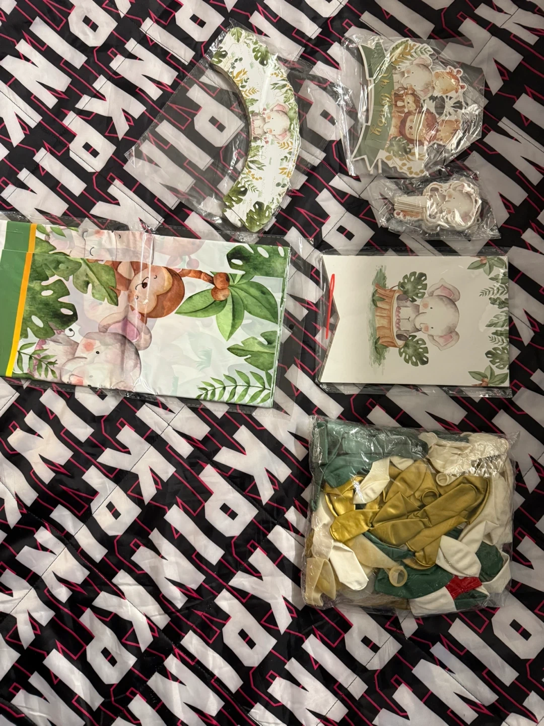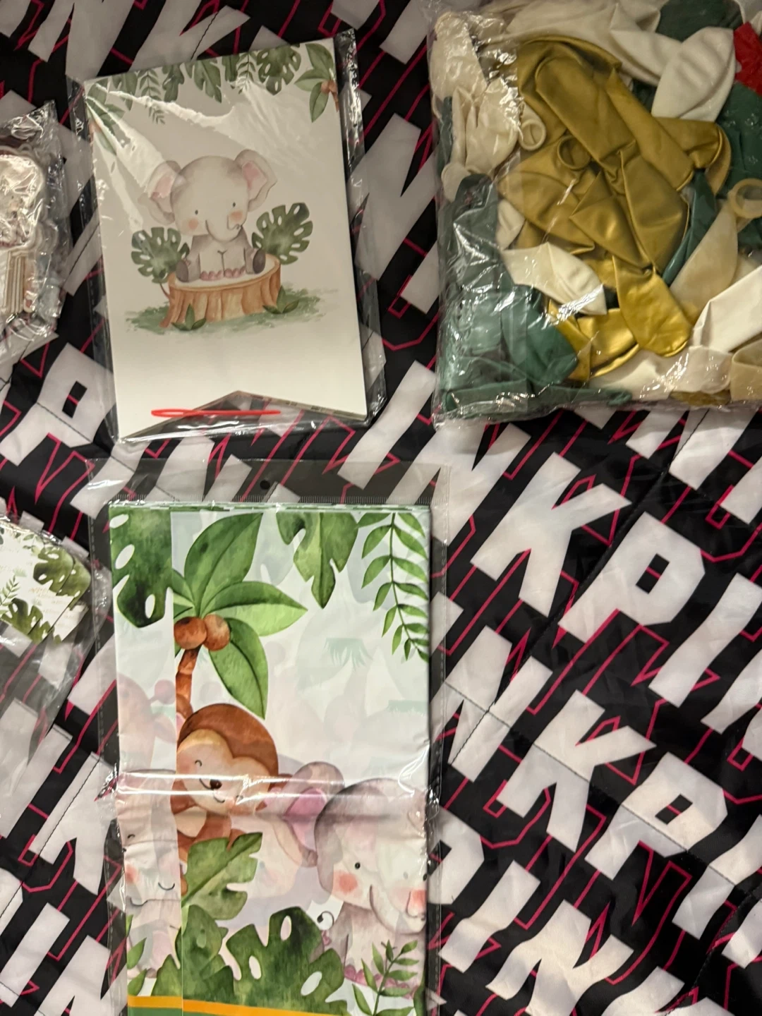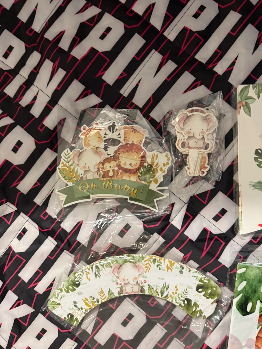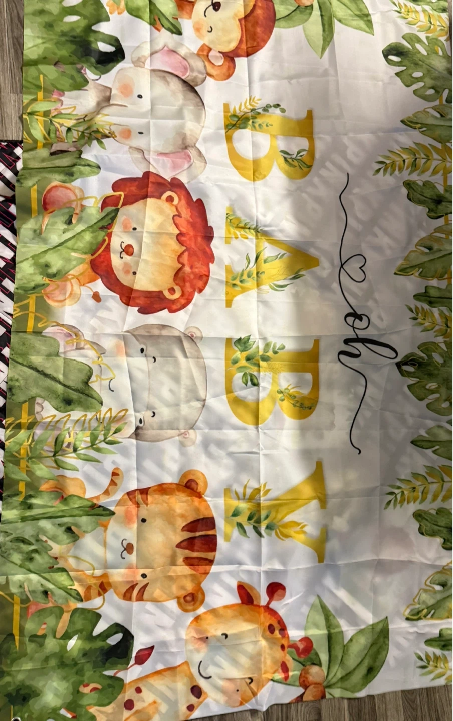 I'm selling a set of jungle-themed baby shower decorations! It includes everything you need to throw a wild celebration for the little one on the way. The set features adorable jungle animals like elephants, lions, monkeys, and tigers, all surrounded by lush greenery. Perfect for creating a fun and memorable atmosphere for your baby shower