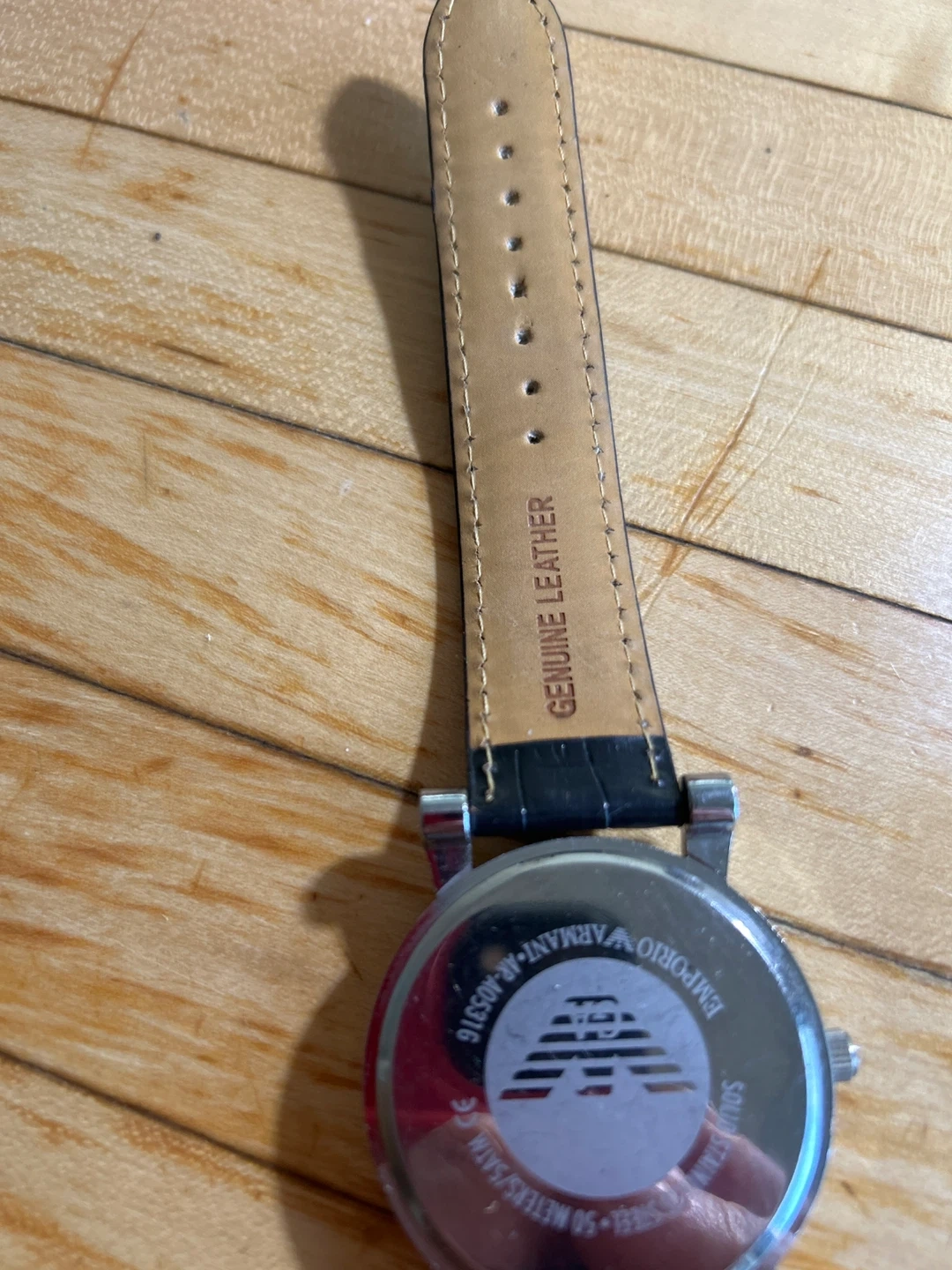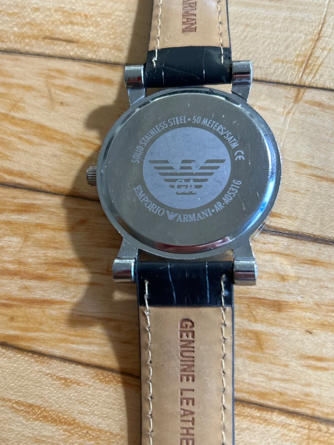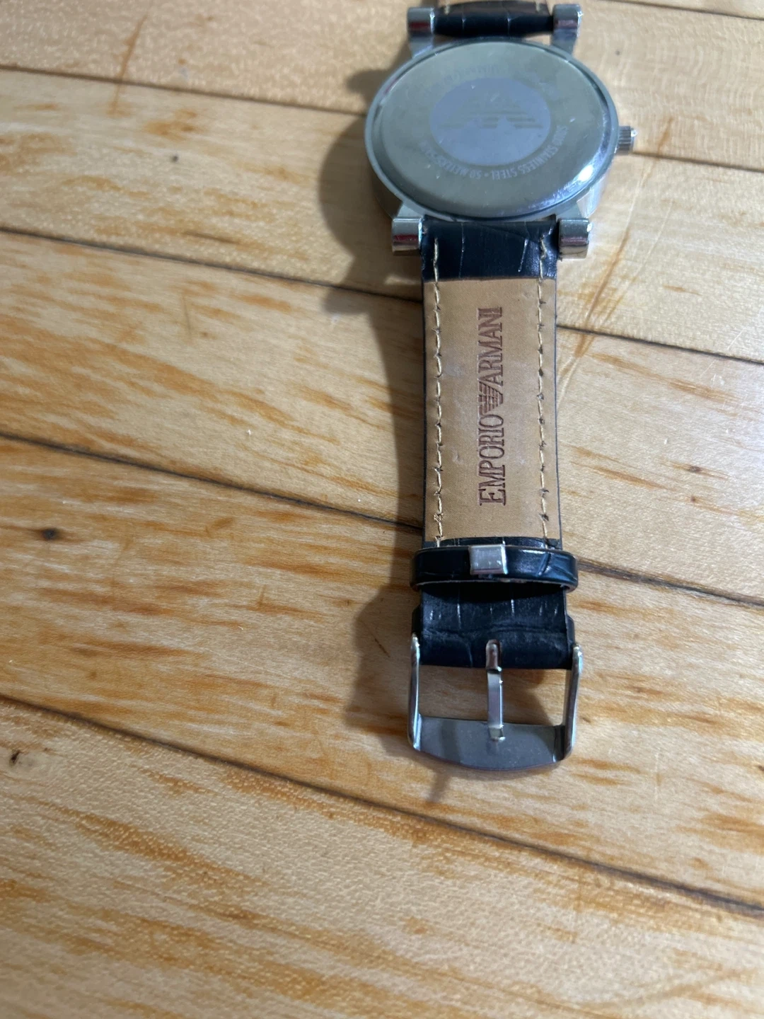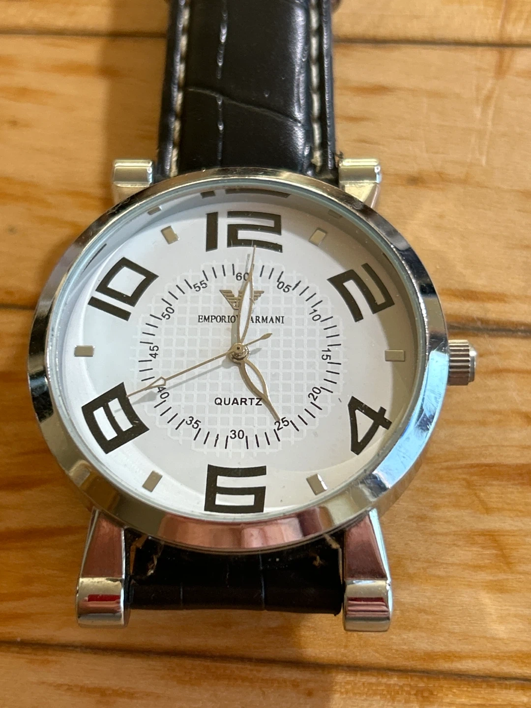 Selling an Emporio Armani quartz watch! It features a black leather strap and a white face with bold numbers. A stylish accessory for any occasion