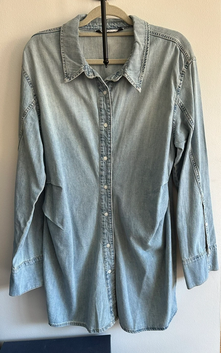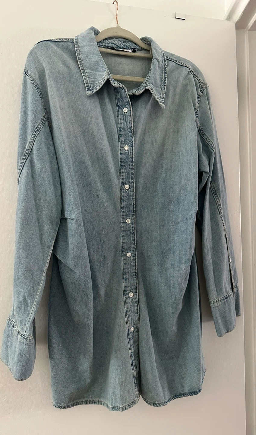 97Selling a Zara TRF denim shirt dress in a light wash denim color. It's new without tags and never been worn. It’s a size XL, but fits like a M/L. It’s stretchy denim.