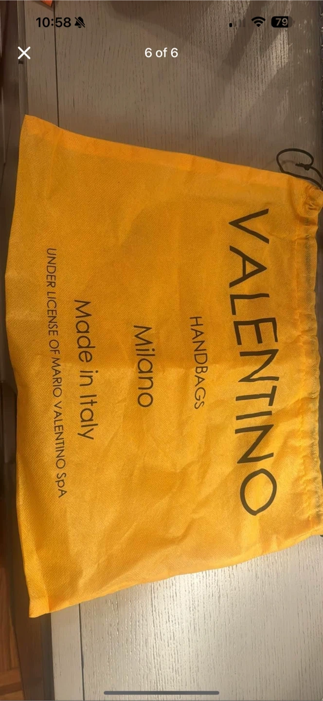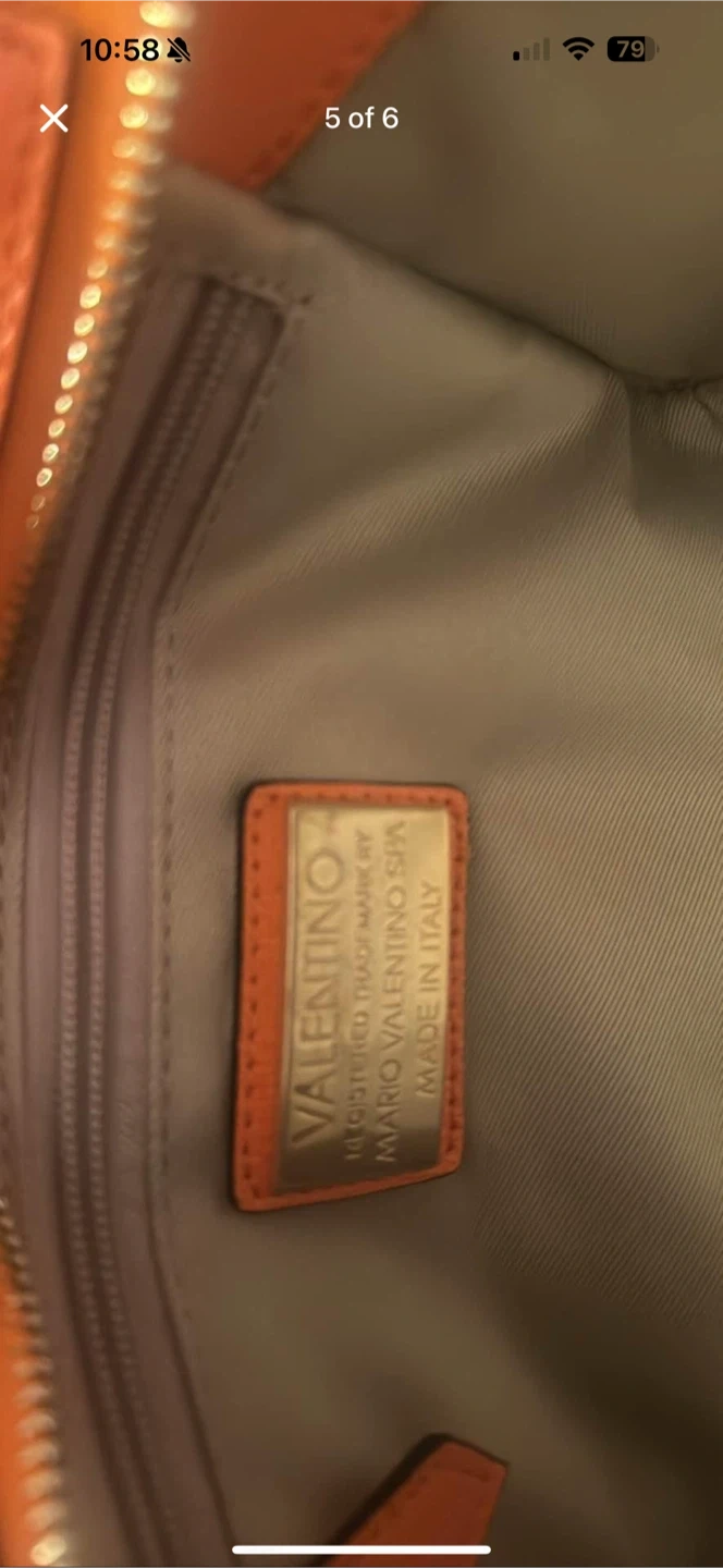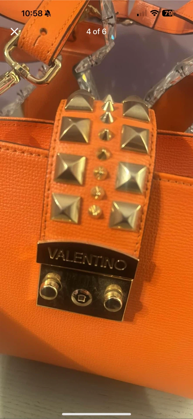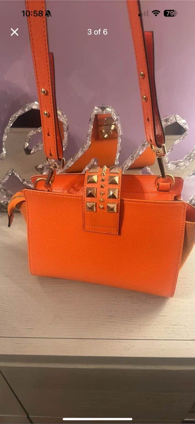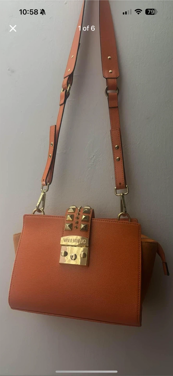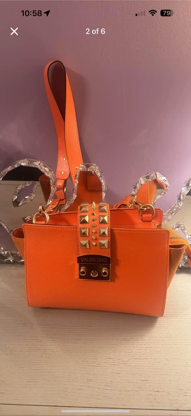 This is a stylish Valentino crossbody bag in a vibrant orange color. It features a studded strap and gold-tone hardware. The interior is lined and in great condition. Perfect for adding a pop of color to any outfit!