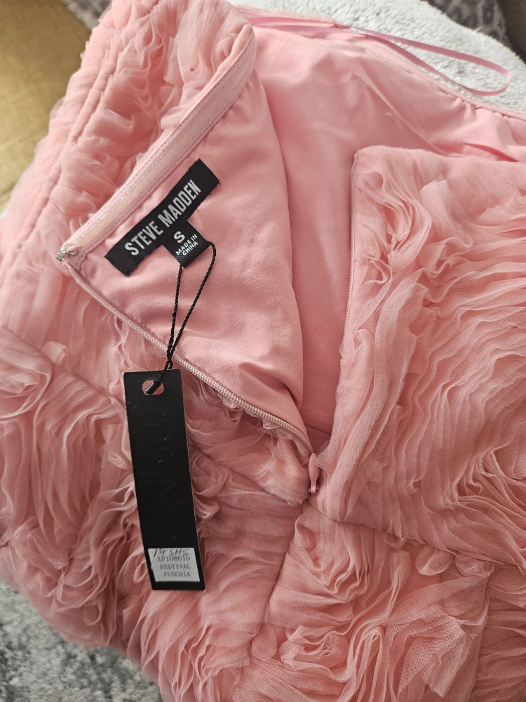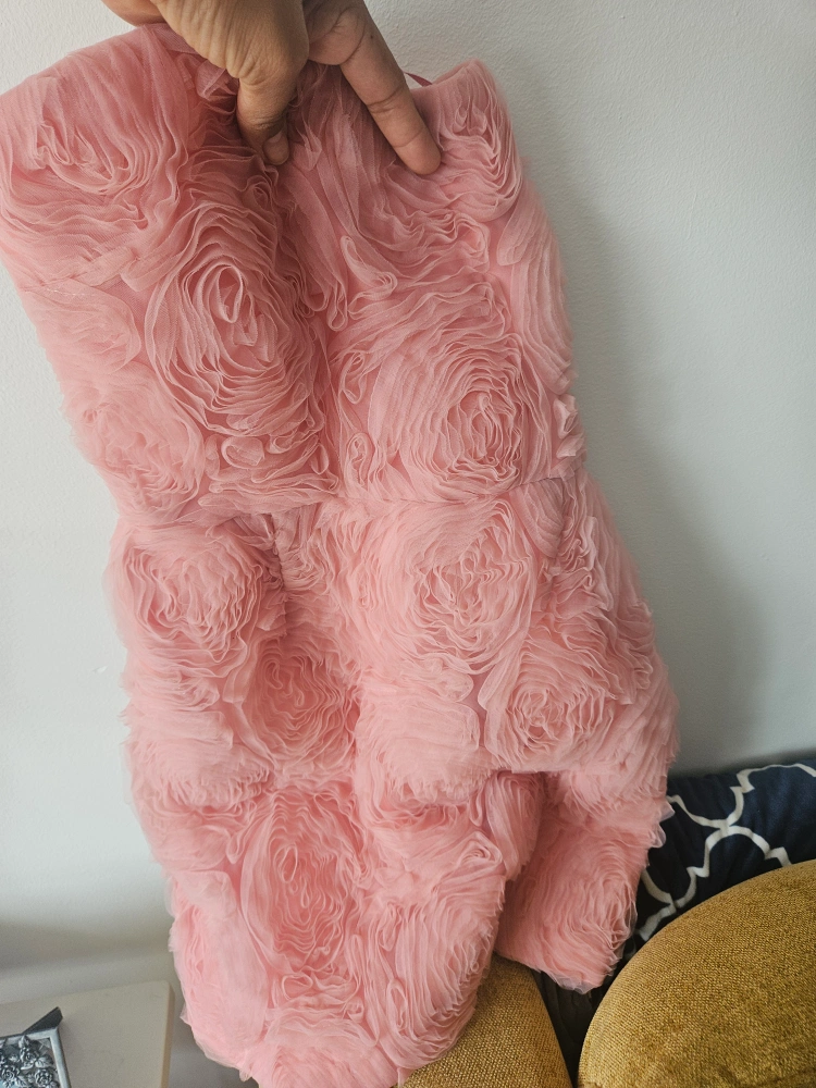 This cute peach-colored strapless mini dress features a lovely floral texture throughout. It's perfect for a party or a night out! It's in great condition and ready for a new home