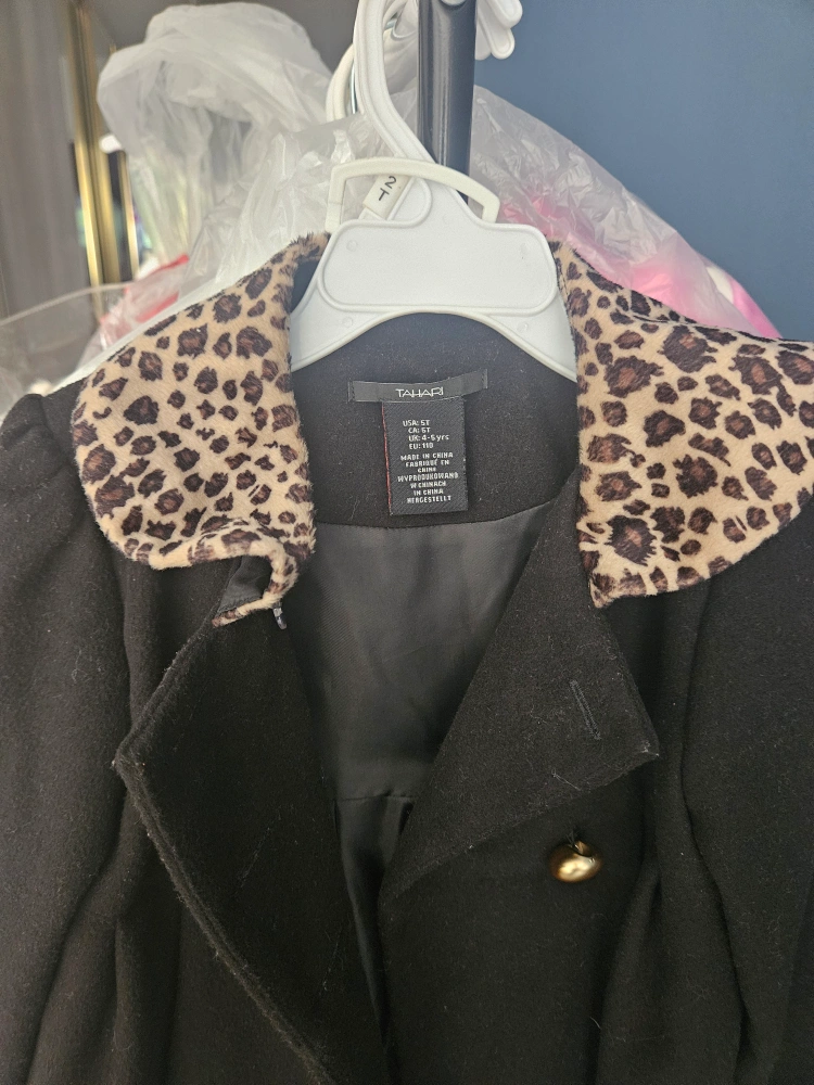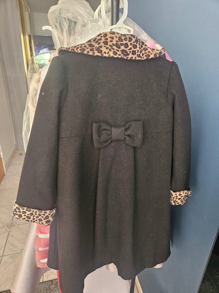 10Selling a cute Tahari girl's coat and dress set. It's a size 5T and features a black coat with a leopard print collar and cuffs. The dress matches with a leopard print top. Perfect for your little one!