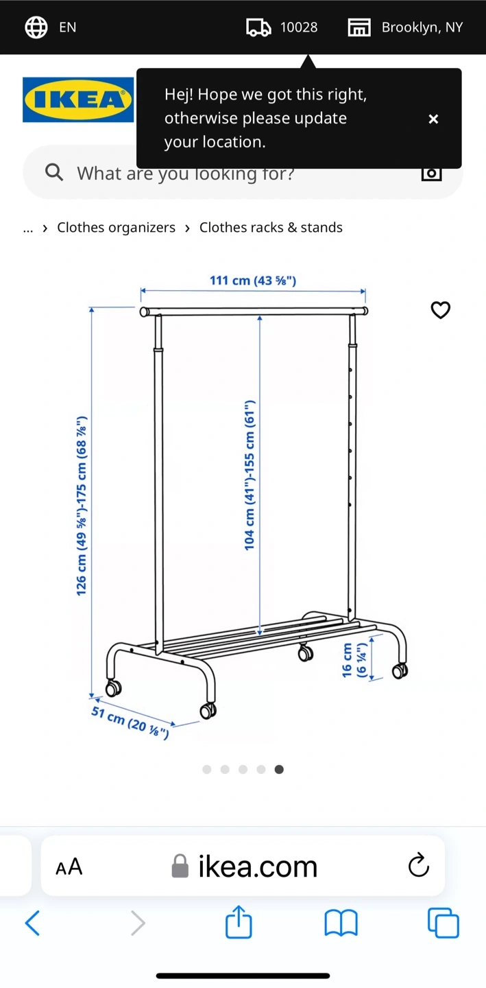 Selling a white IKEA clothes rack! It's in great condition and ready to help organize your wardrobe. The dimensions are 111 cm (43 3/4") wide, 126 cm (49 5/8") - 175 cm (68 7/8") high, and 51 cm (20 1/8") deep