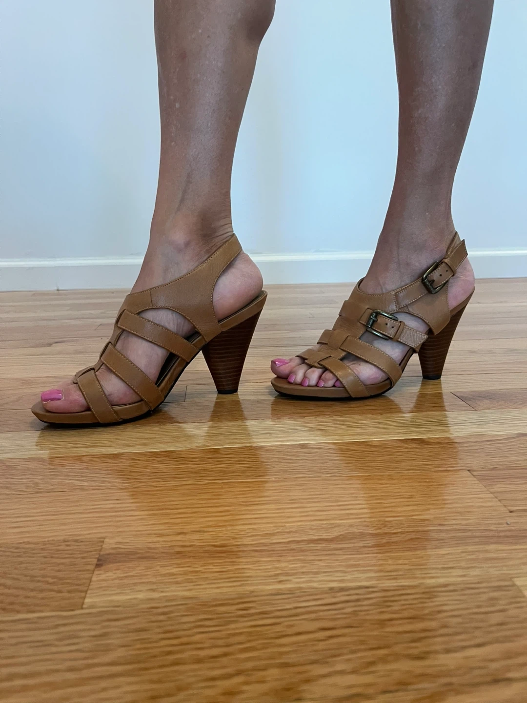 These are some leather heeled sandals. They have a cone heel and a strappy design.