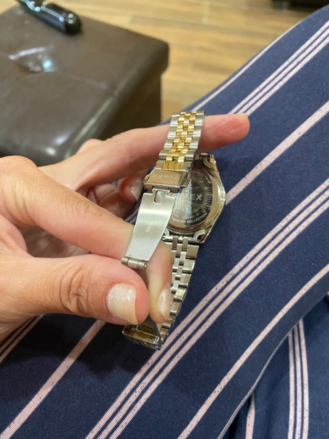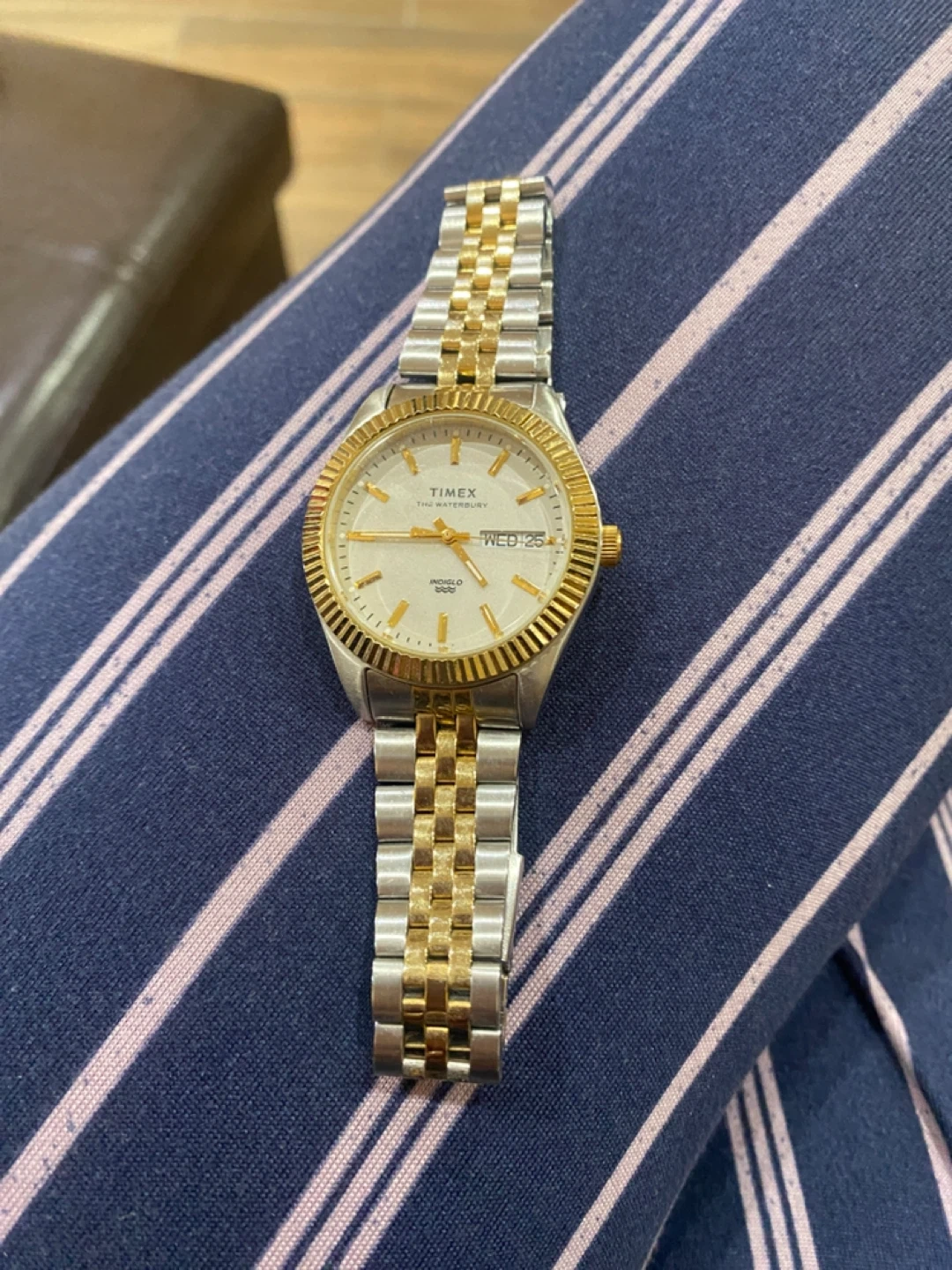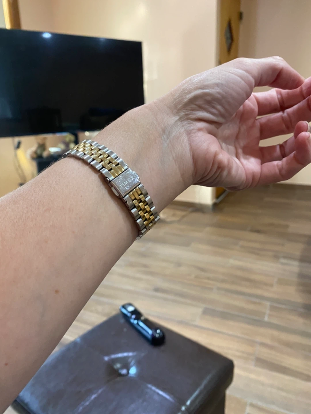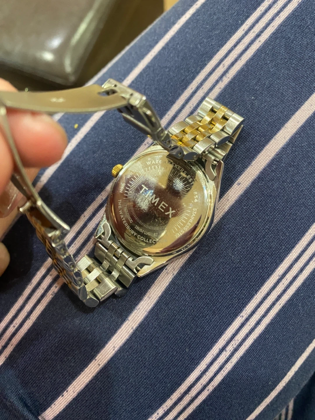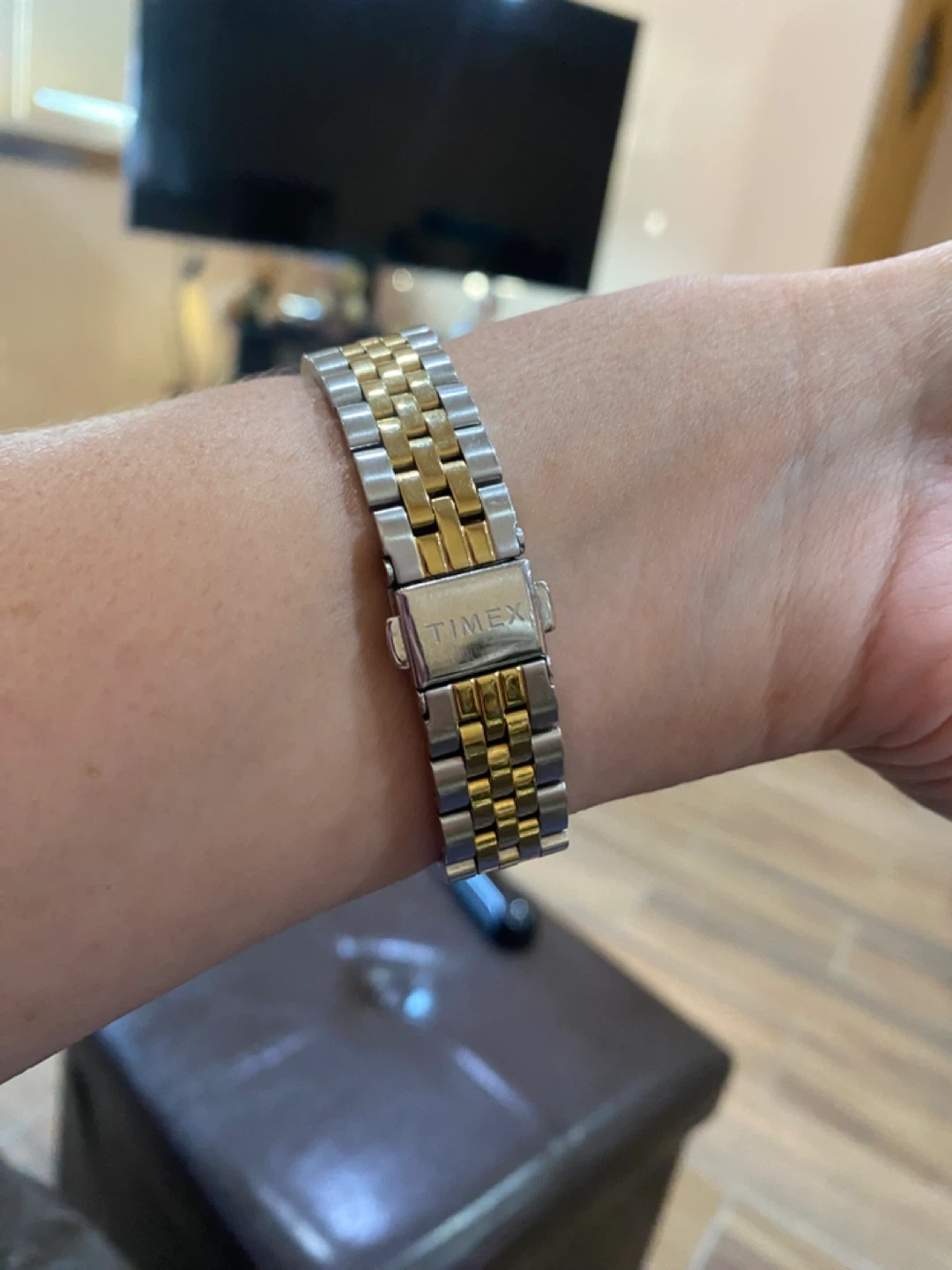 70Selling a Timex The Waterbury watch in a stylish two-tone finish! It features a stainless steel and gold-tone band. The watch displays the day and date, adding to its functionality. A classic timepiece for any occasion Band is 8 inches Person wearing Has 7 inch wrist No additional links available Pick up in Bensonhurst bklyn Text 347-366-4713