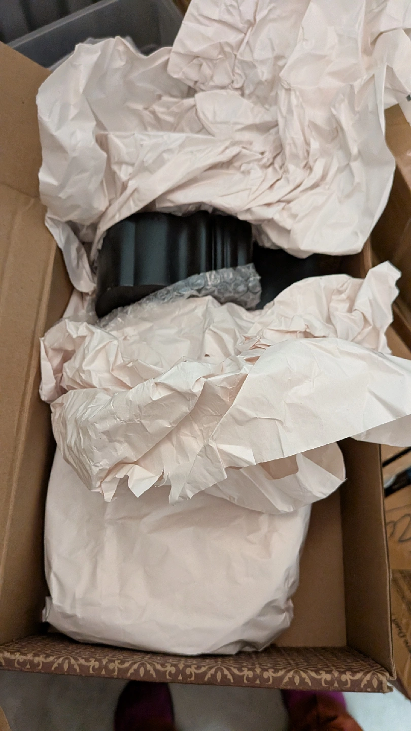 This is a black metal decorative object, still in its box with the original packaging. It's a unique piece that would look great in any home!