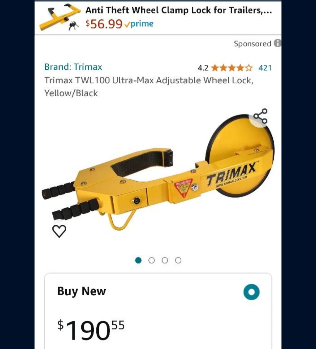 59Selling a Trimax TWL100 Ultra-Max Adjustable Wheel Lock in yellow and black. This is a great anti-theft device for trailers. Originally listed for $190.55.