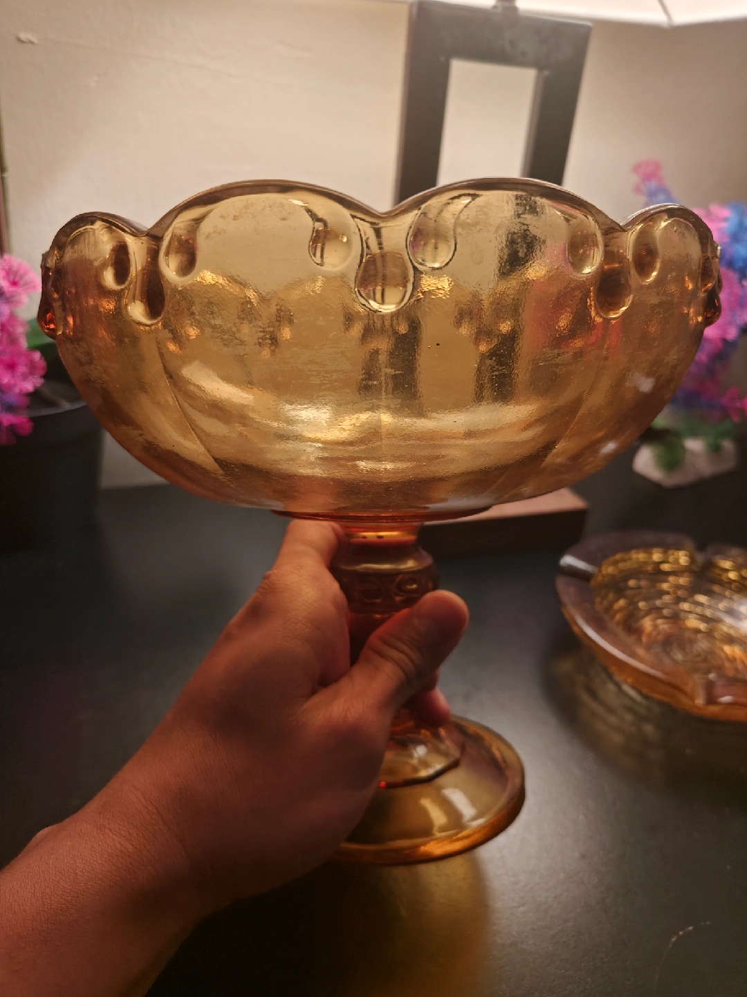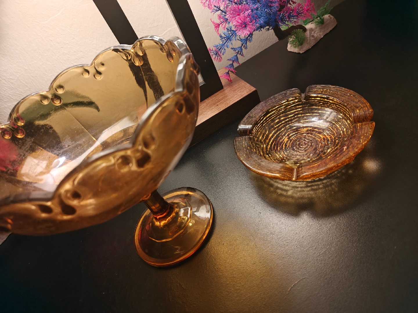 Selling a vintage amber glass compote bowl and matching ashtray. Both pieces have a beautiful amber color and a unique vintage design. They'd make a great addition to any collection or home decor!