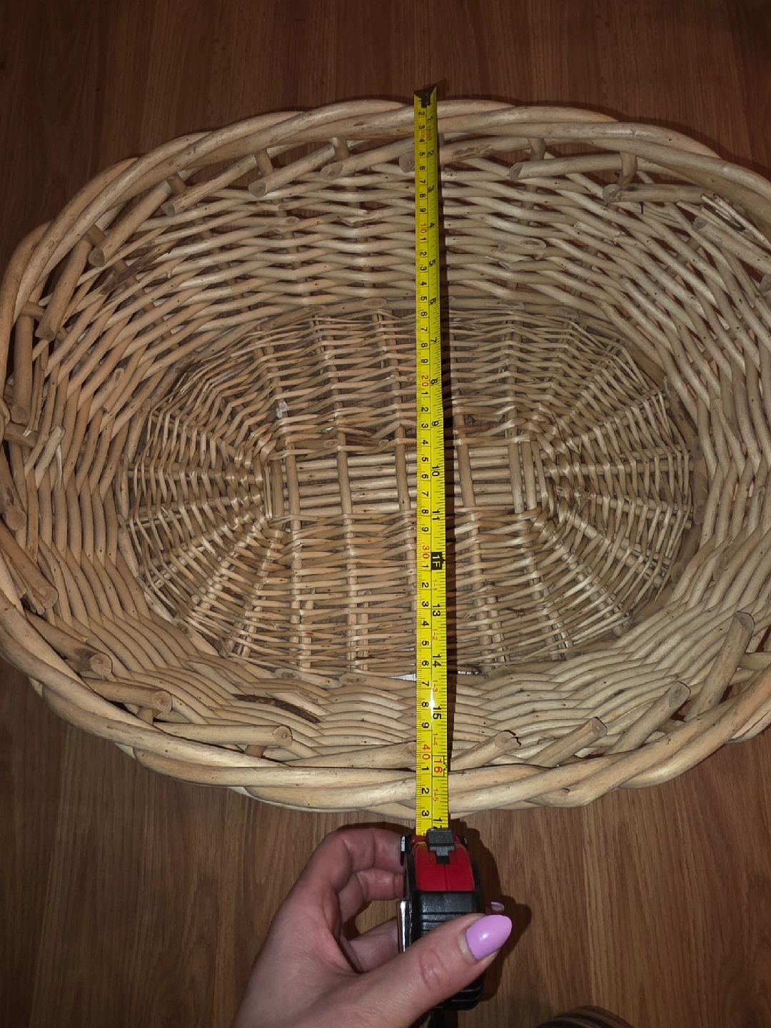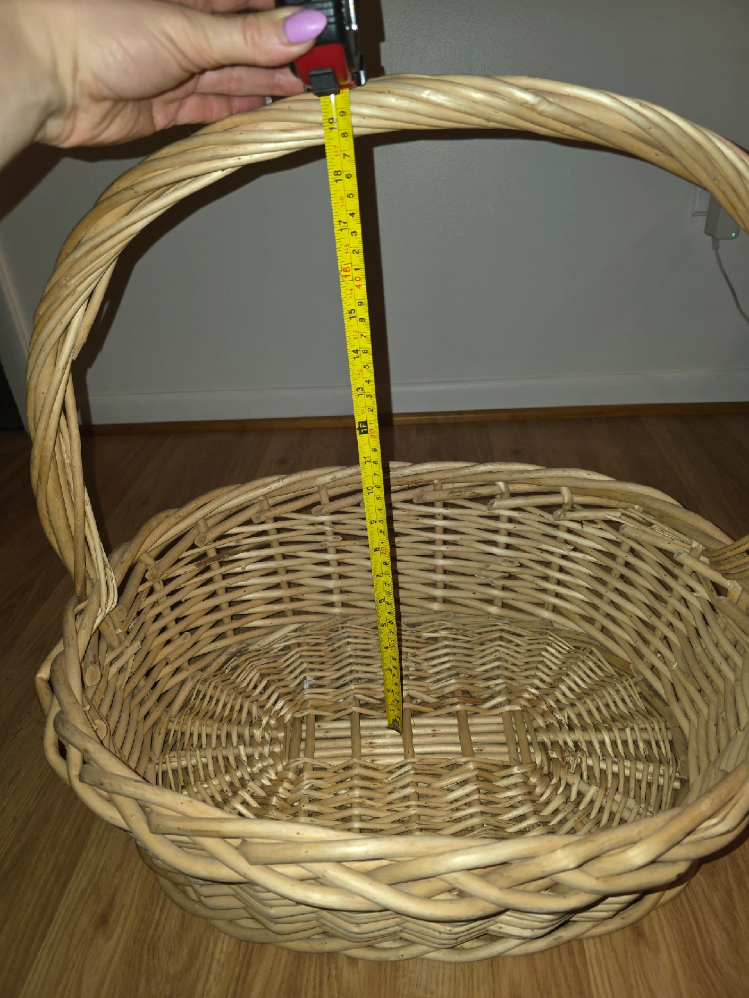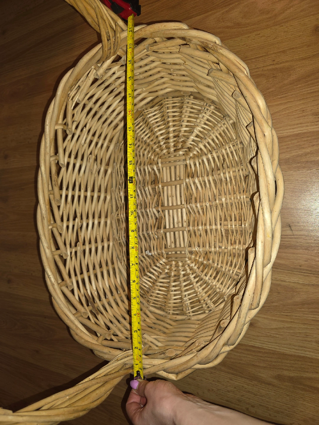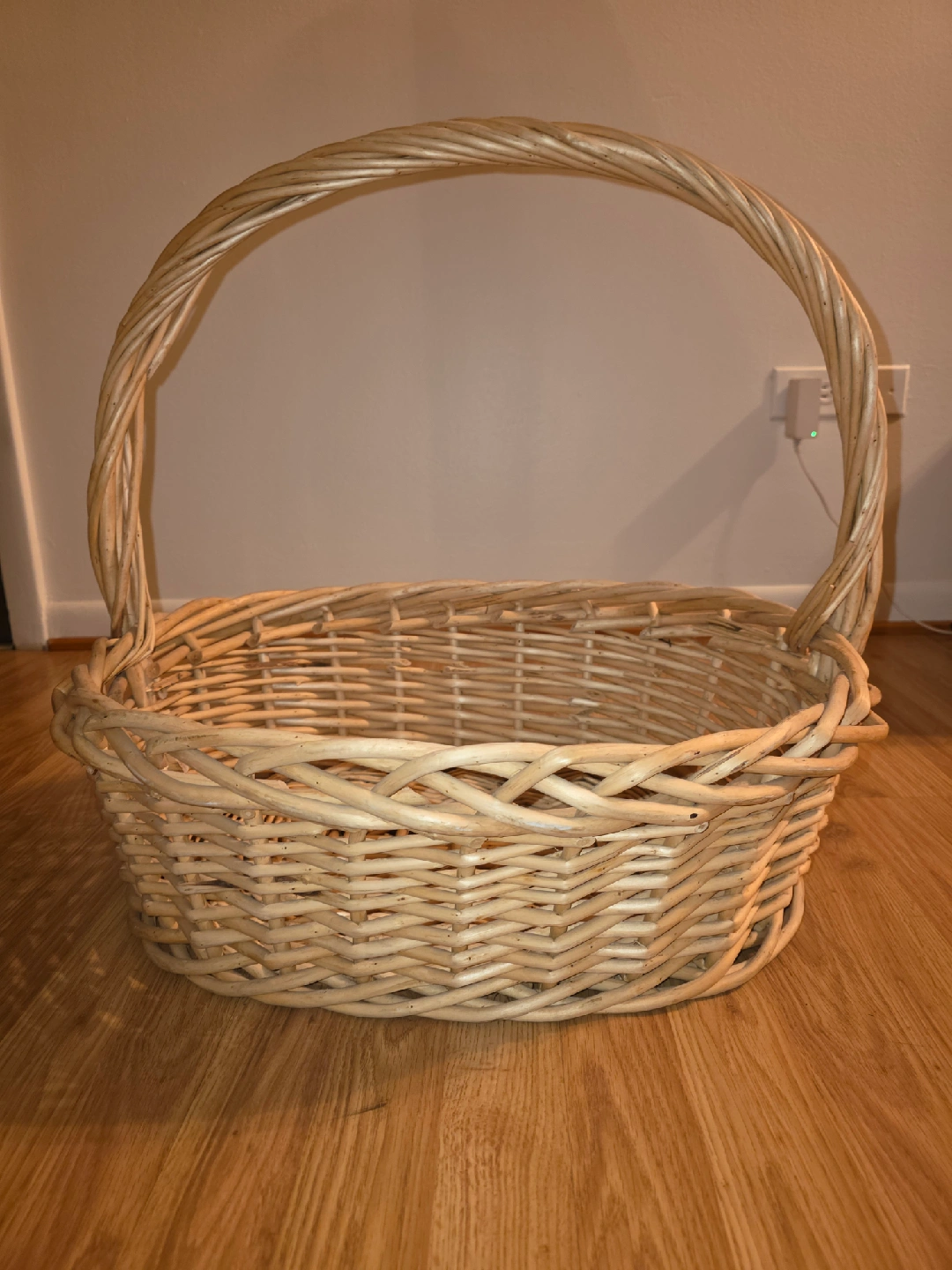 Selling a wicker basket with a handle. It's in perfect condition and the perfect size for storage or decoration. It measures approximately 20 inches in height and 22 inches in diameter.