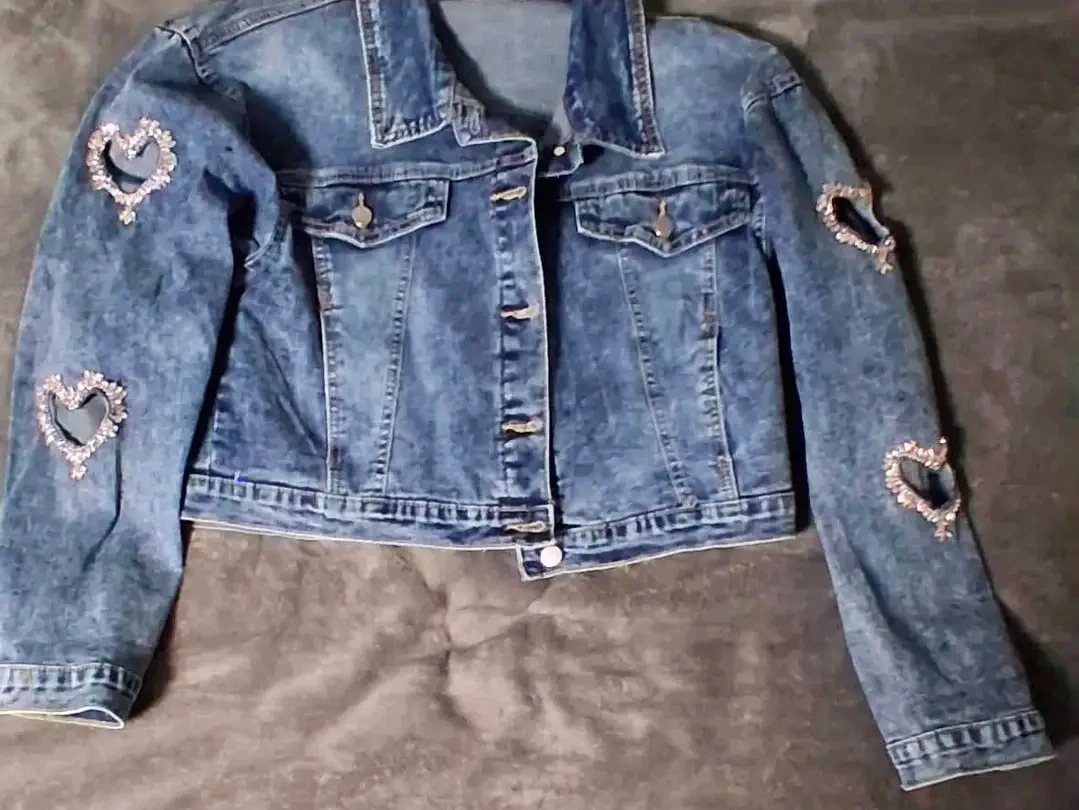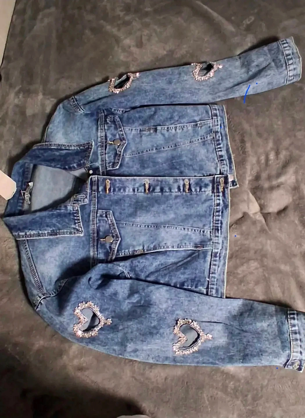 Cute denim jacket with heart cutouts and embellishments on the sleeves! It's a fun and stylish piece to add to your wardrobe. The jacket is in great condition and ready for a new owner