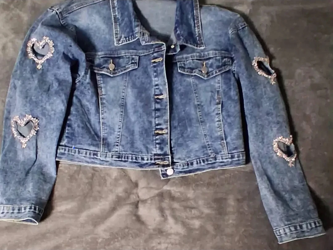 Cute denim jacket with heart cutouts and embellishments on the sleeves! It's a fun and stylish piece to add to your wardrobe. The jacket is in great condition and ready for a new owner