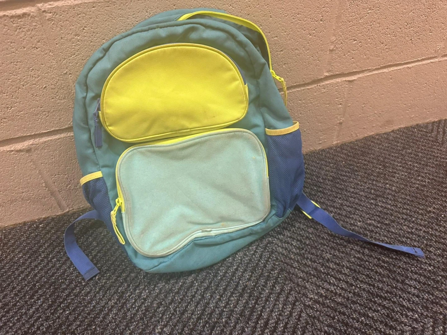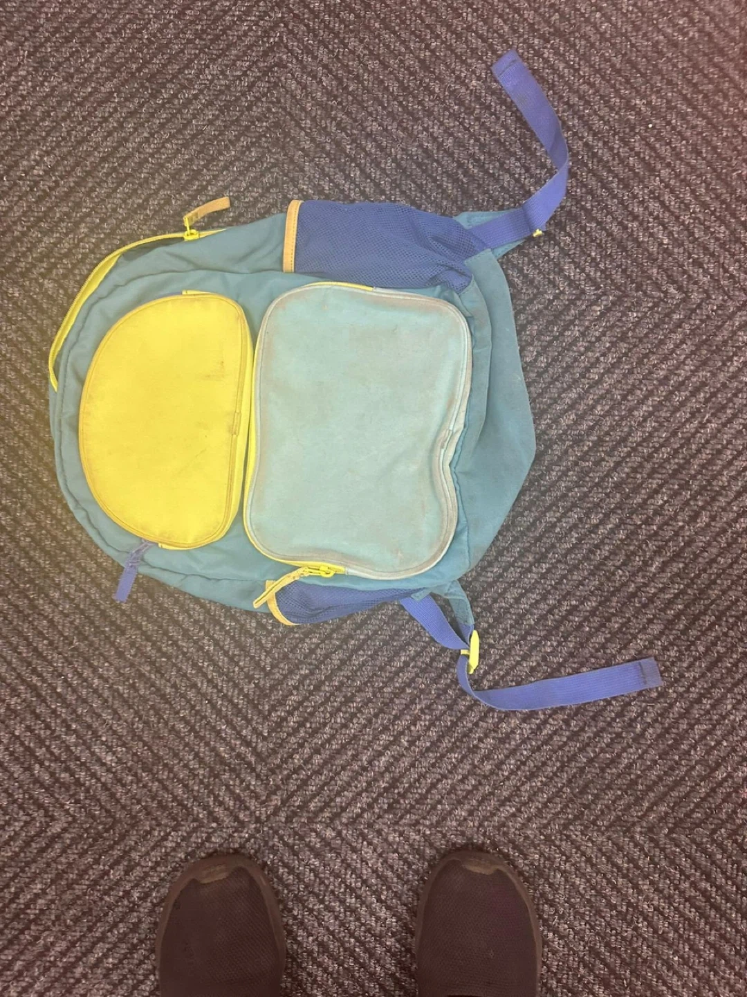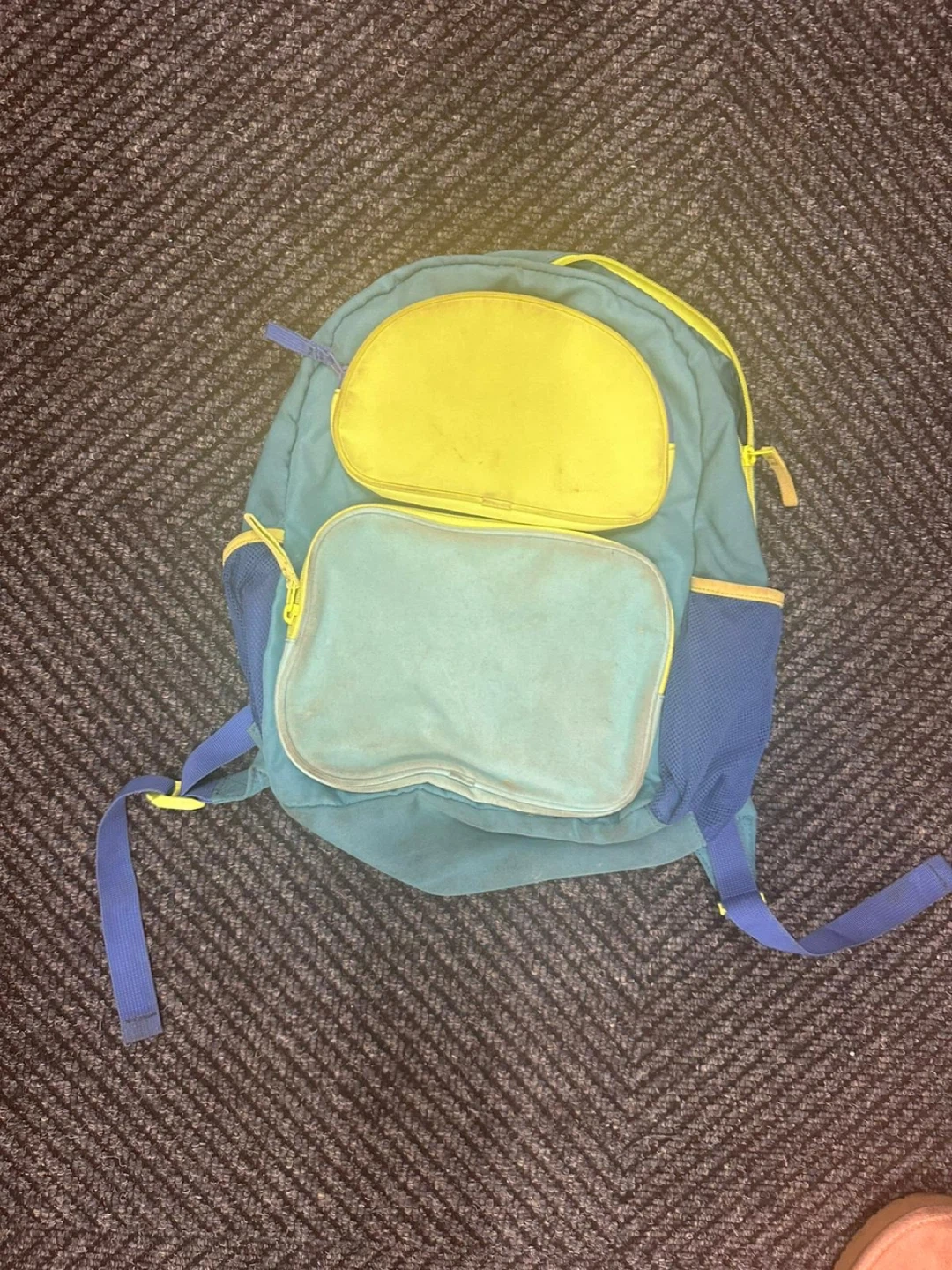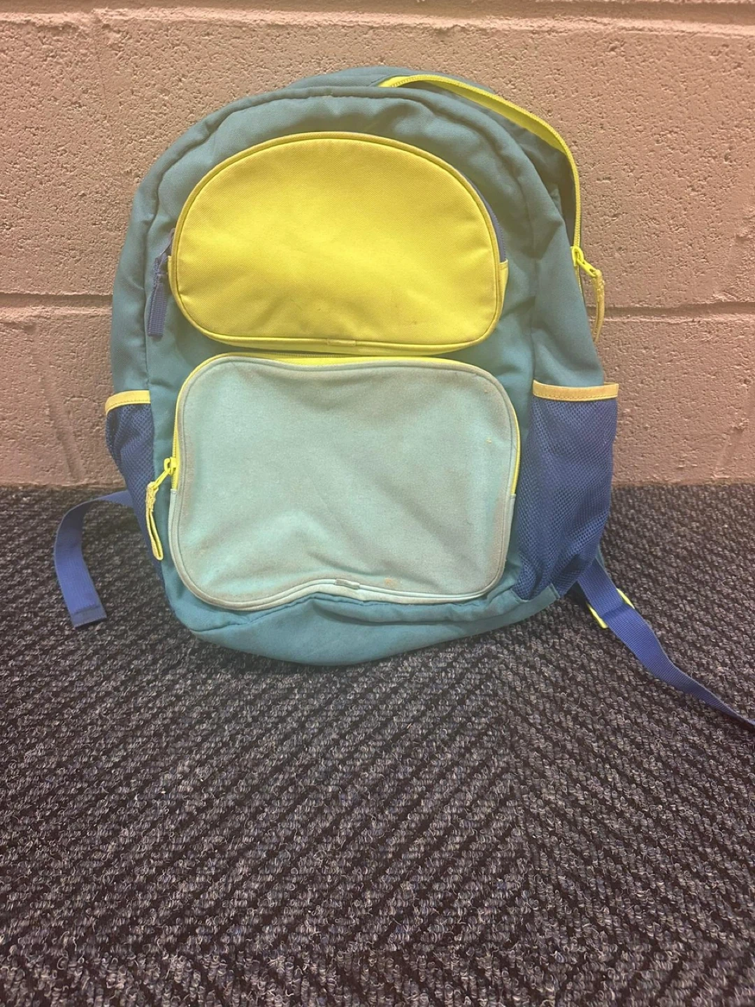 This backpack is perfect for kids! It features a fun color combination of blue and yellow. It has a couple of pockets and two side mesh pockets. It's in good condition and ready for a new adventure
