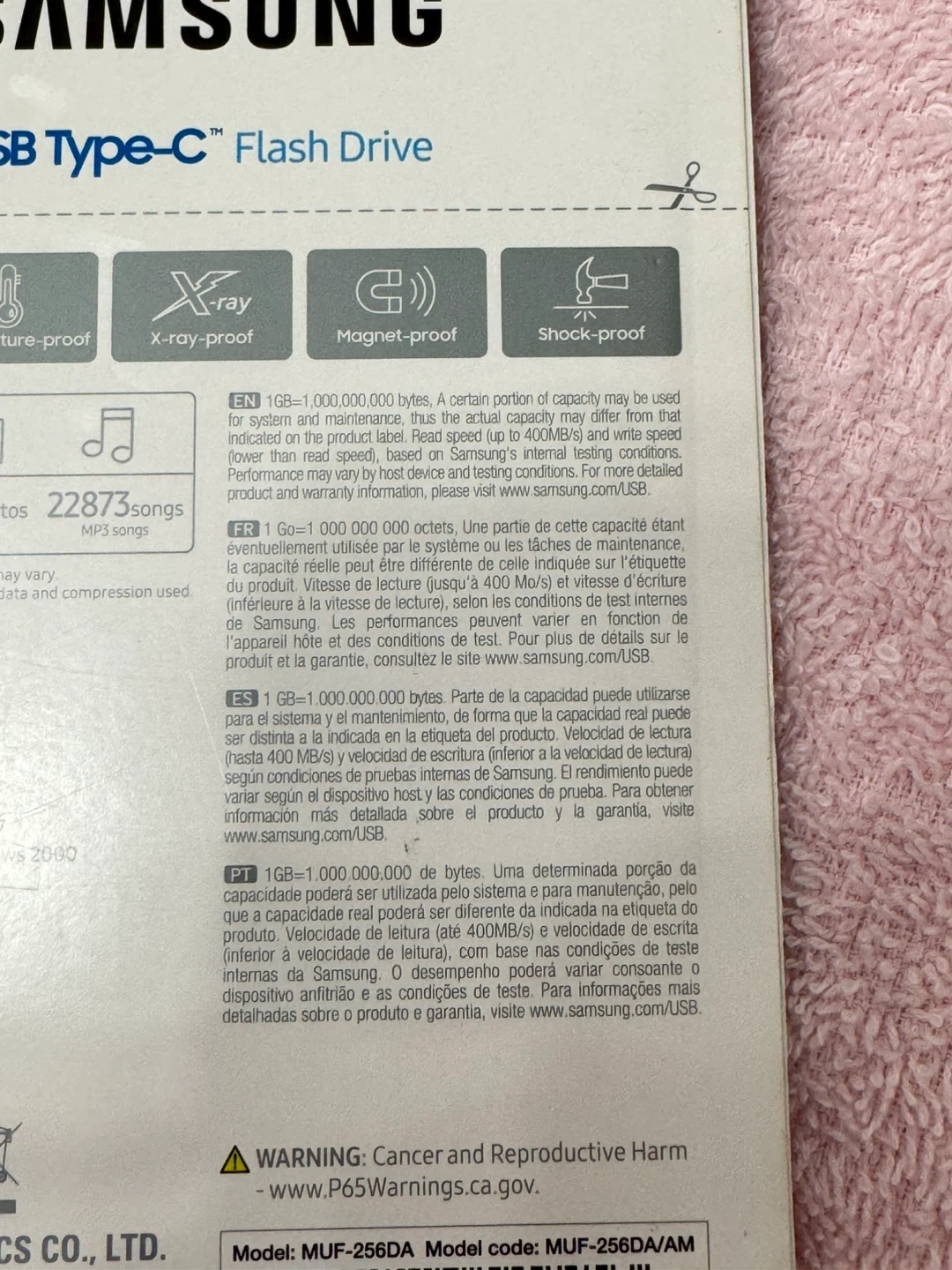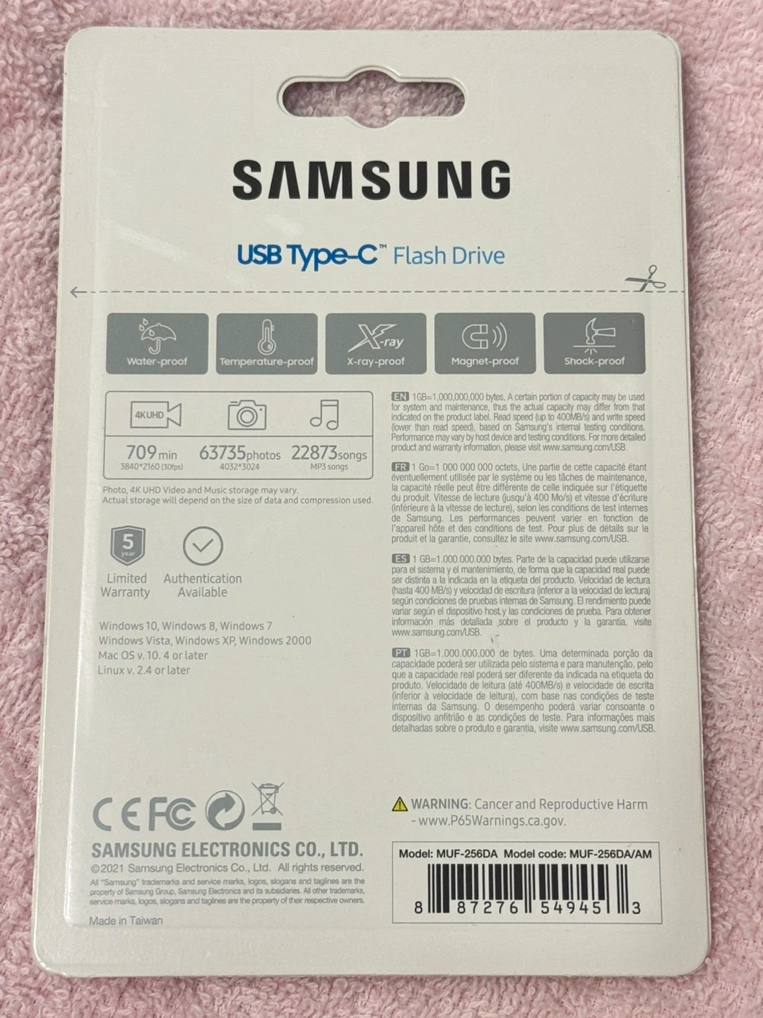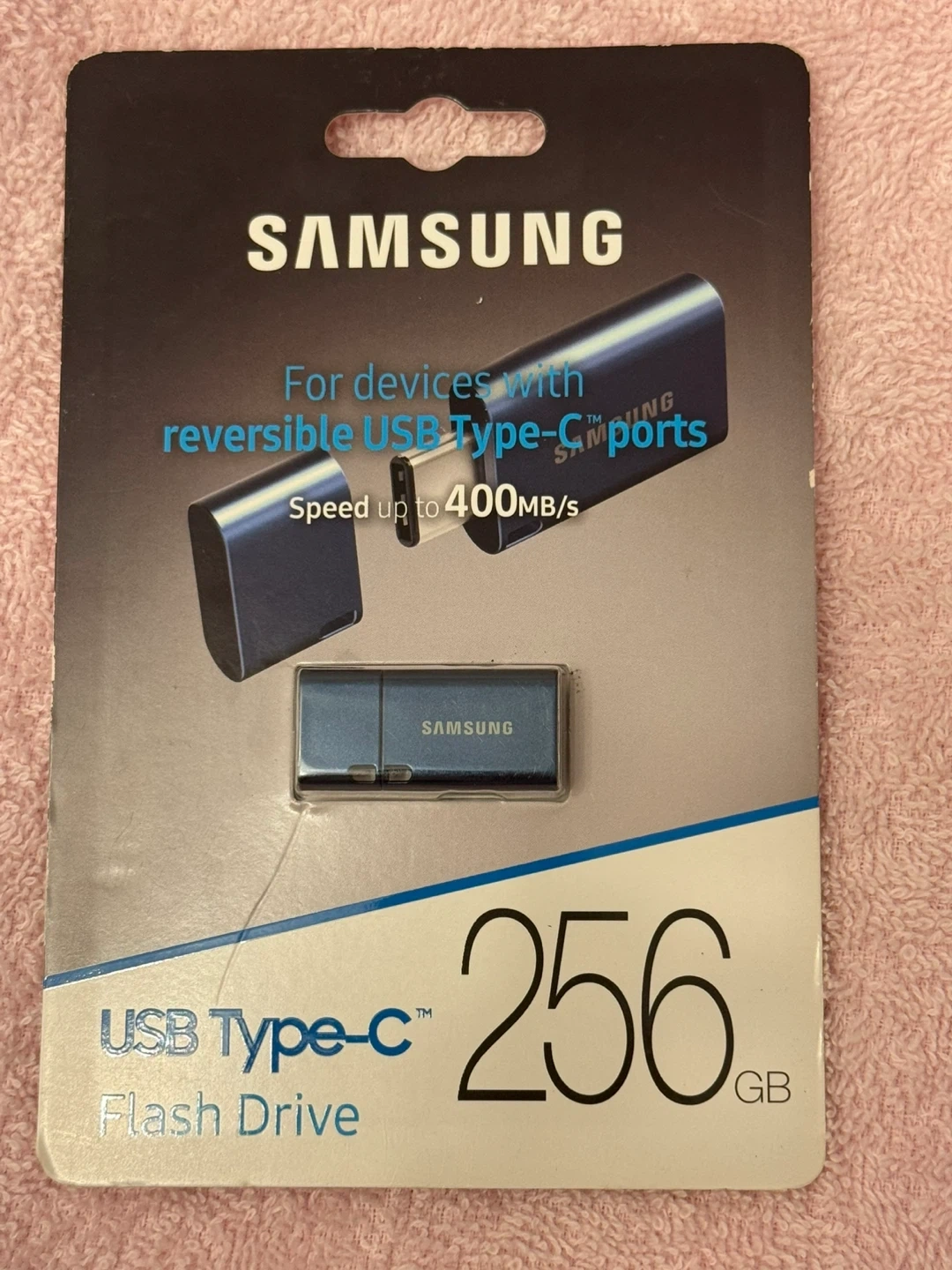 Selling a brand new Samsung 256GB USB Type-C Flash Drive! It's still in its original packaging. This flash drive is waterproof, temperature-proof, X-ray-proof, magnet-proof, and shock-proof. It's perfect for devices with reversible USB Type-C ports and boasts speeds up to 400MB/s