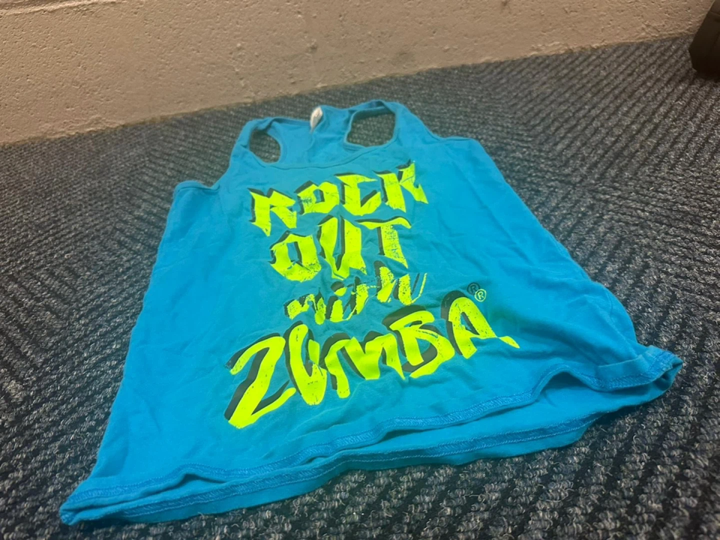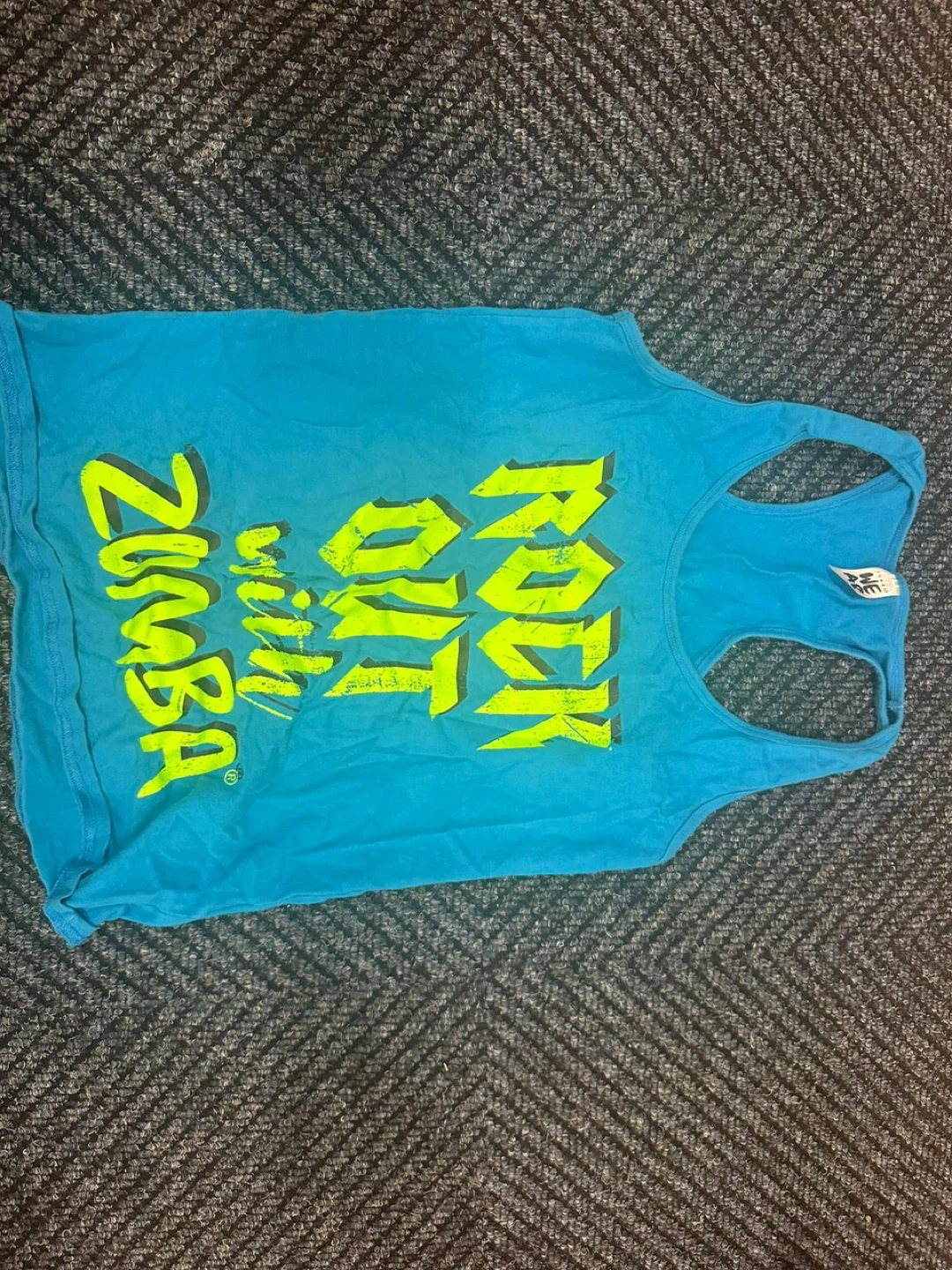 I'm selling a Zumba Rock Out With Zumba tank top! It's a vibrant blue color with neon yellow lettering. Perfect for your next Zumba class or workout!