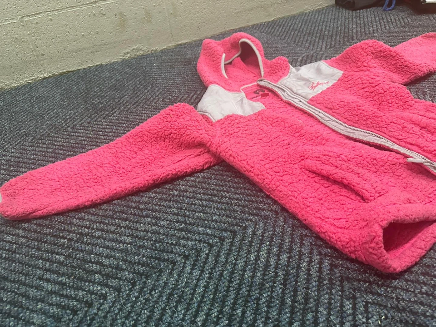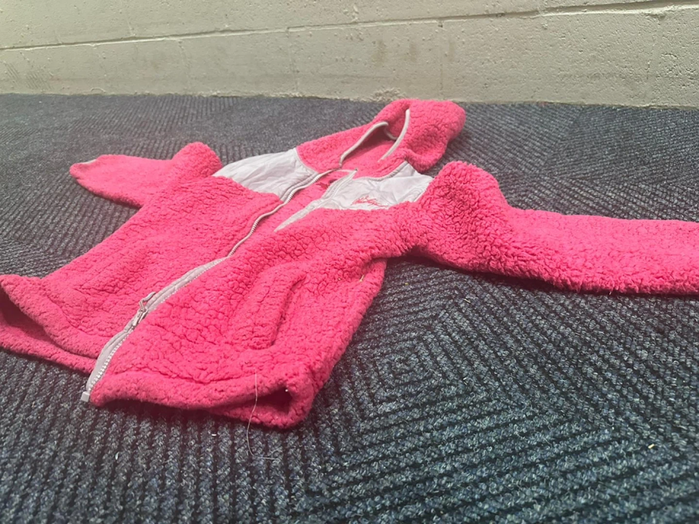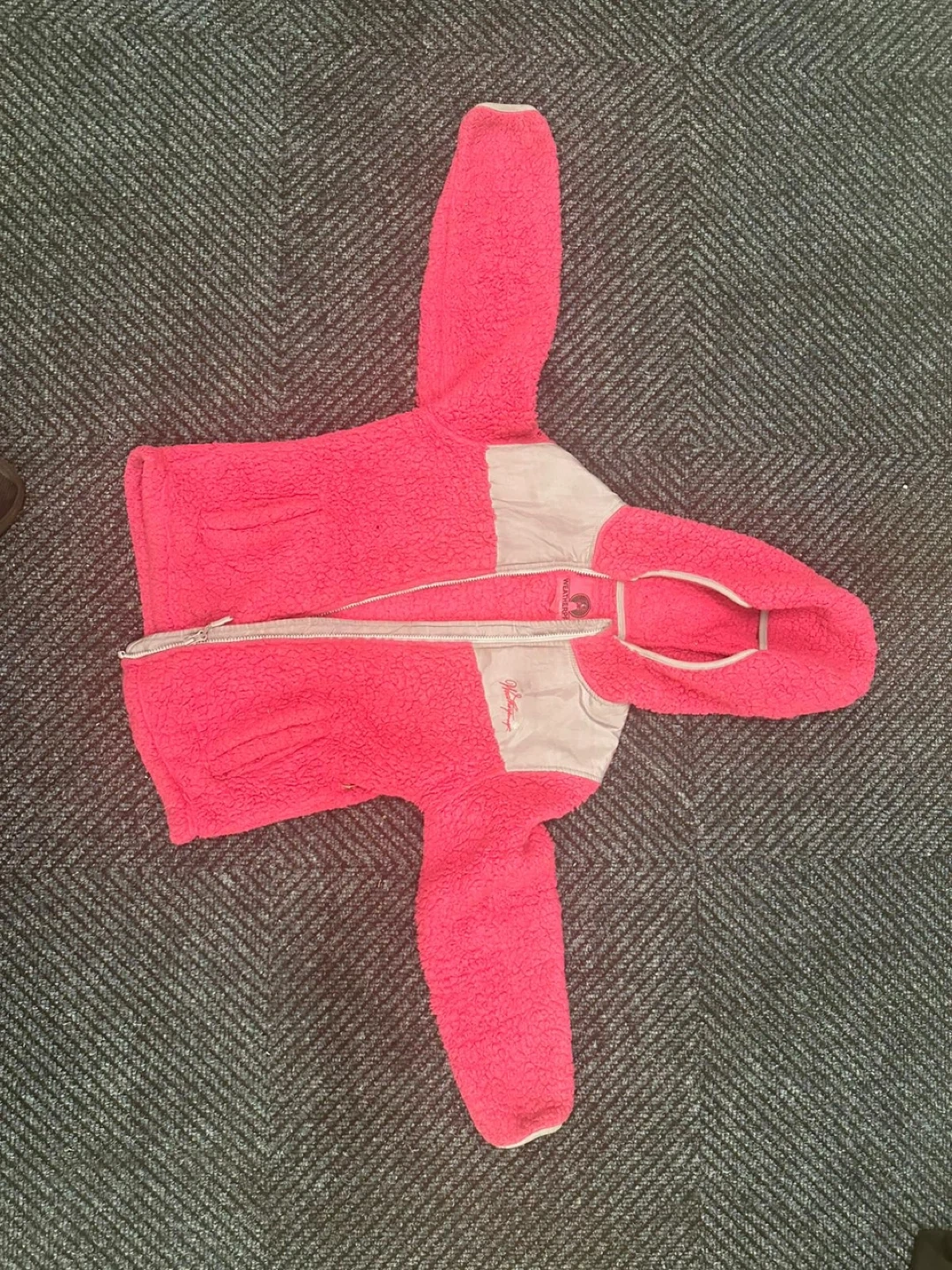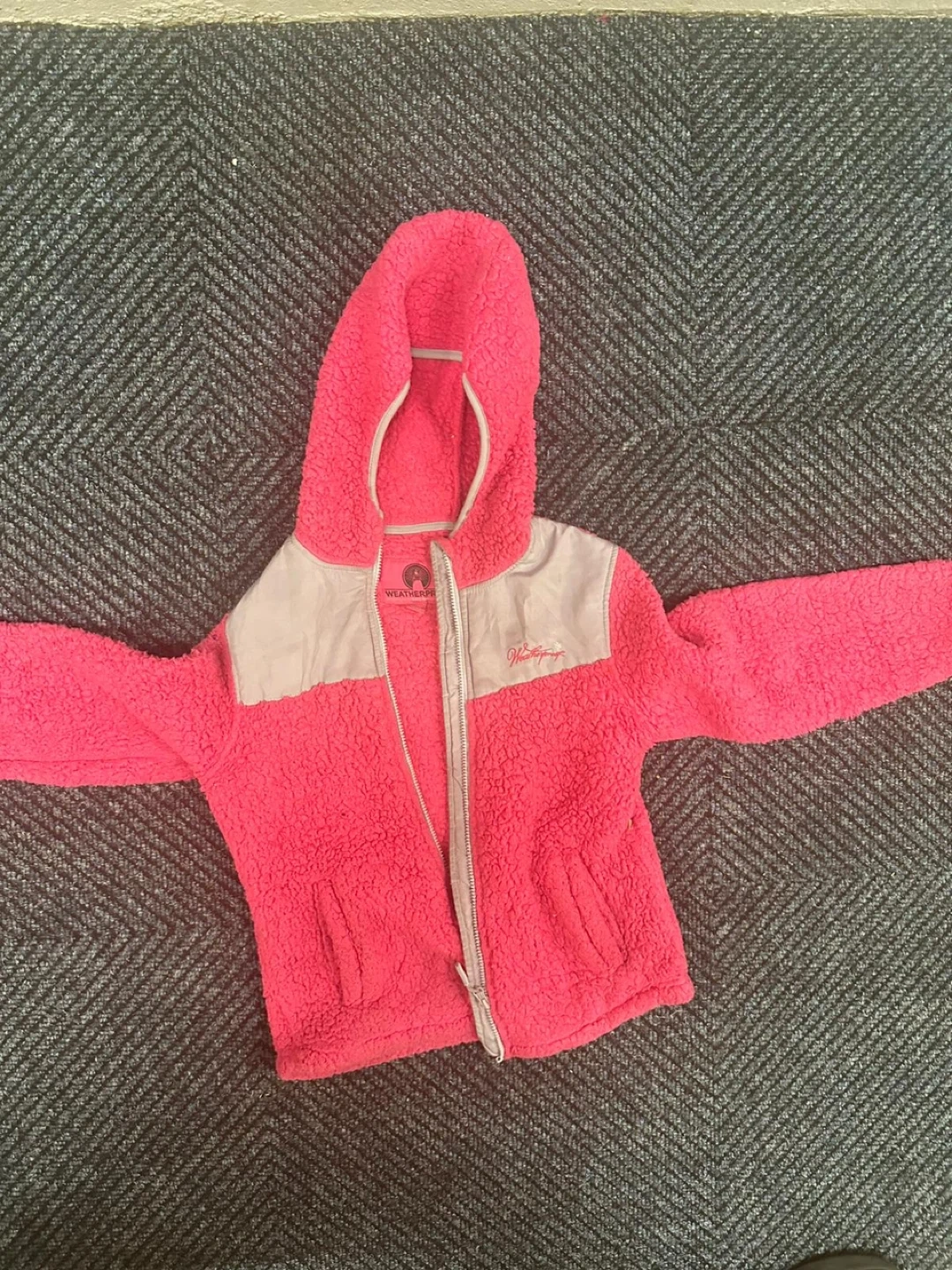 Here's a cozy pink fleece jacket from Weatherproof! It's perfect for keeping your little one warm and snug. The jacket features a hood and a zip-up front, making it easy to put on and take off. It also has a cute design with a contrasting color on the upper chest area