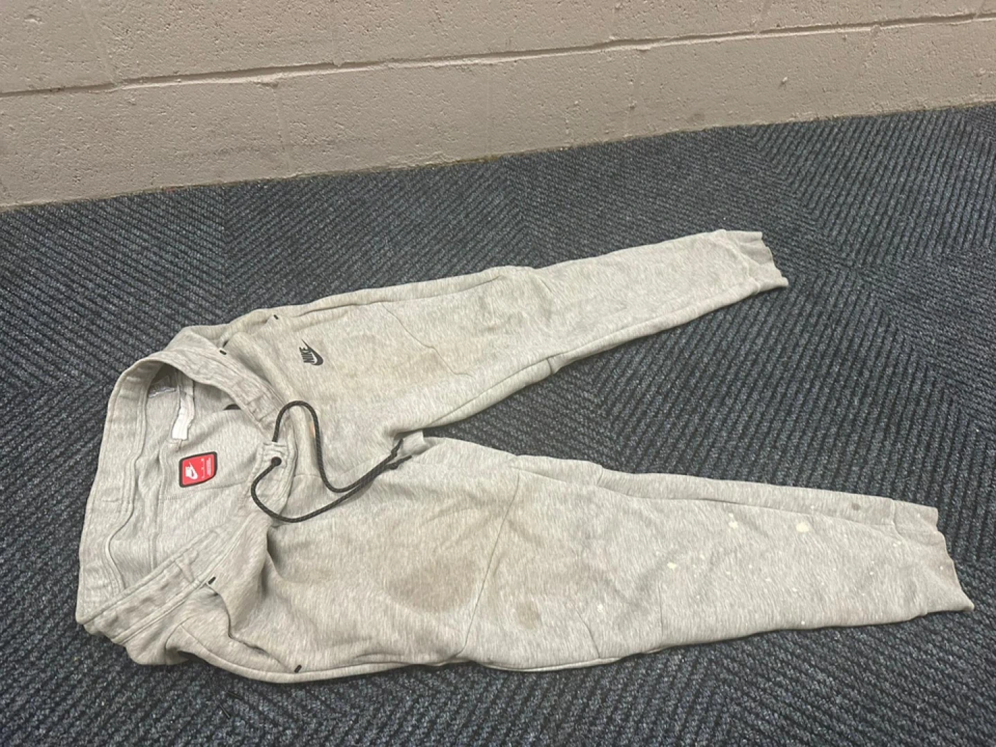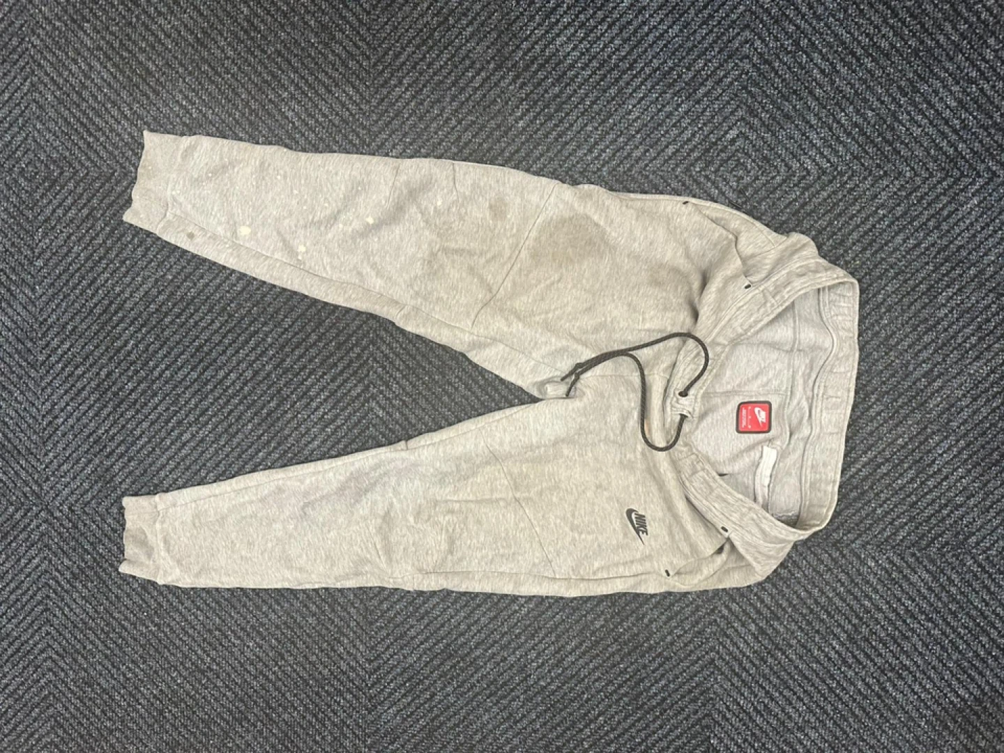 These are gray Nike sweatpants with a drawstring. They show signs of wear.