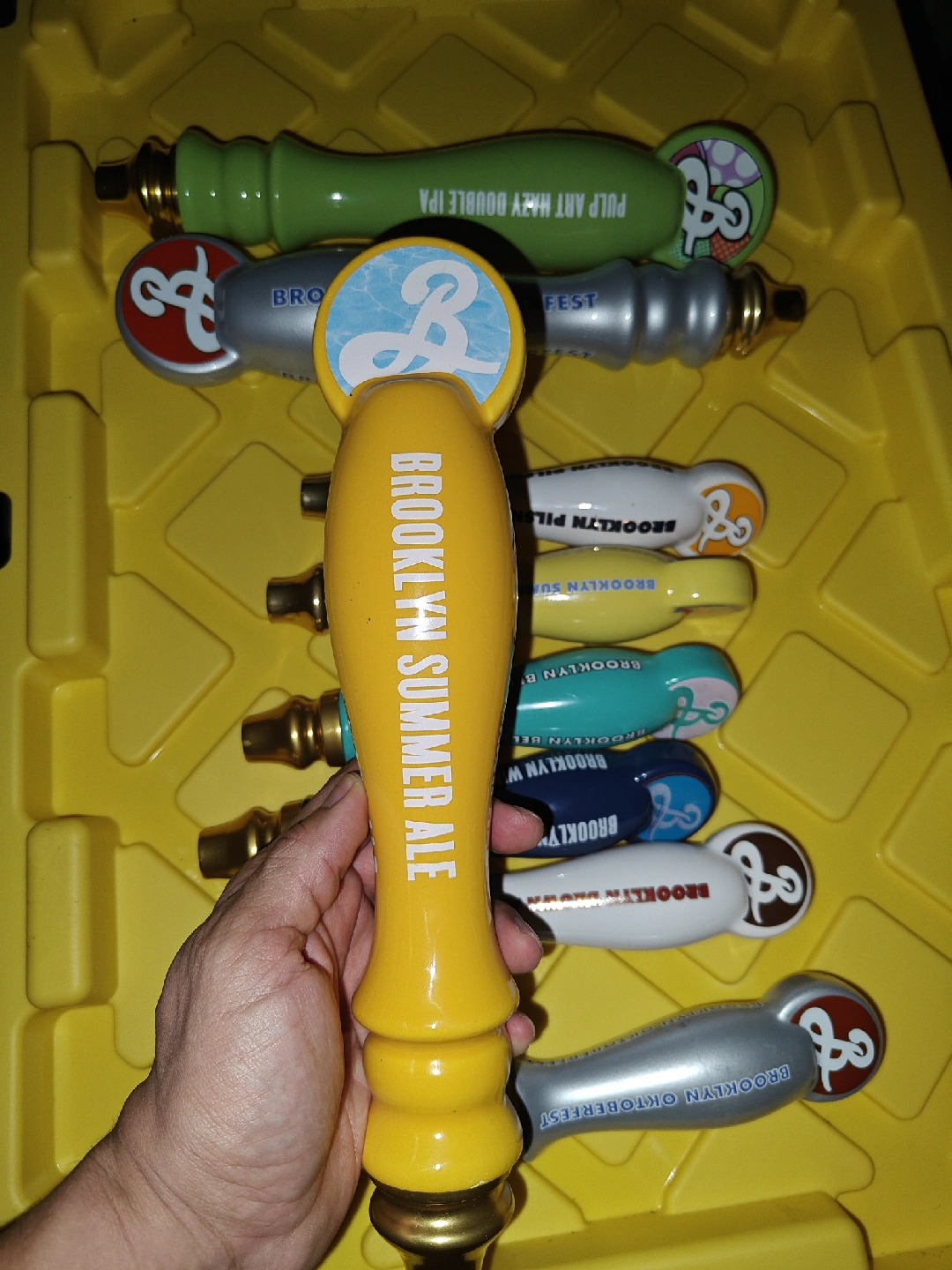 Selling a collection of unique beer tap handles! There's a variety of styles, including Brooklyn Winter Lager, Brooklyn Brown Ale, Brooklyn Oktoberfest, Brooklyn Pilsner, Brooklyn Bel Air Sour, Brooklyn Summer Ale, and Harp Lager. Great for adding a touch of brewery flair to your home bar
