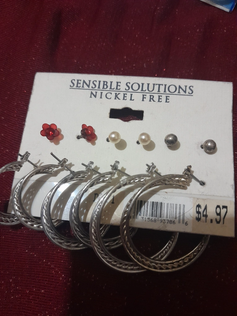 Selling a set of earrings from Sensible Solutions. This set is nickel free and includes hoop earrings, as well as red flower, pearl, and silver ball stud earrings. The original price was $4.97