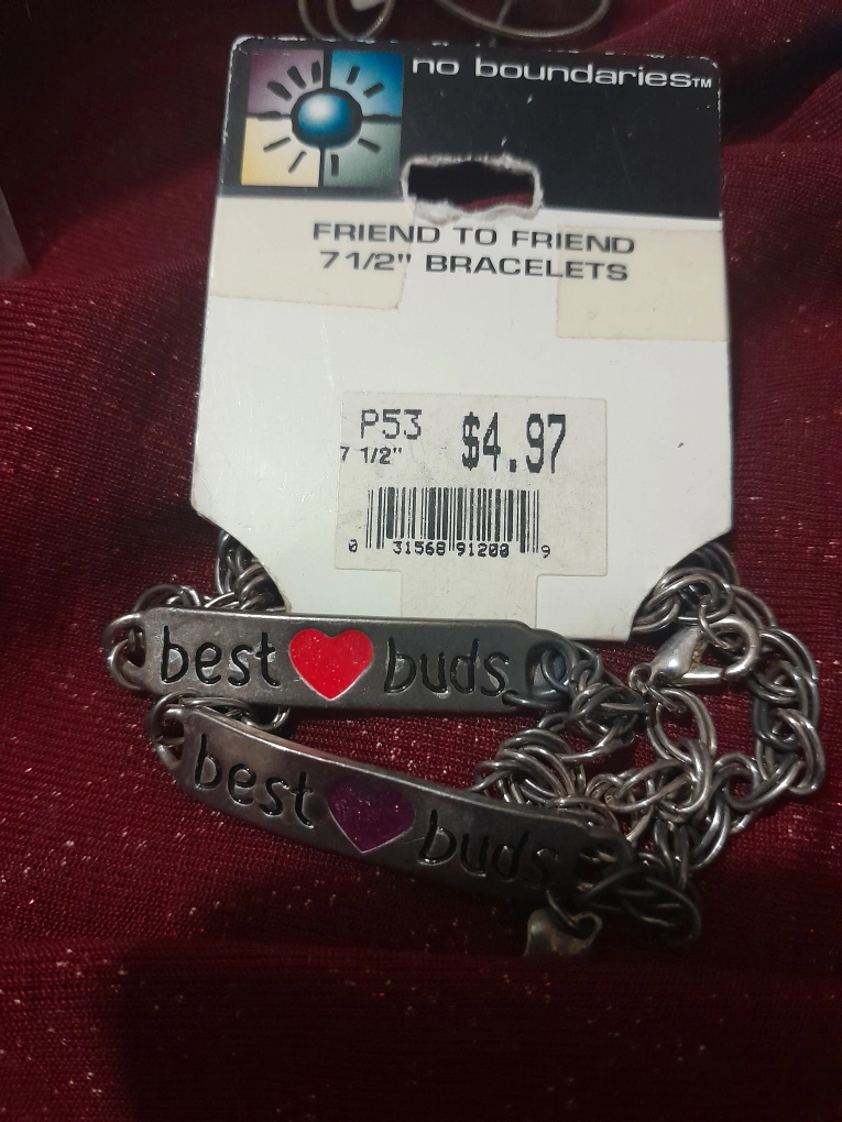232These are No Boundaries 'Friend to Friend' bracelets! They're 7 1/2" in size and feature a 'best buds' design with a heart accent. Originally priced at $4.97.