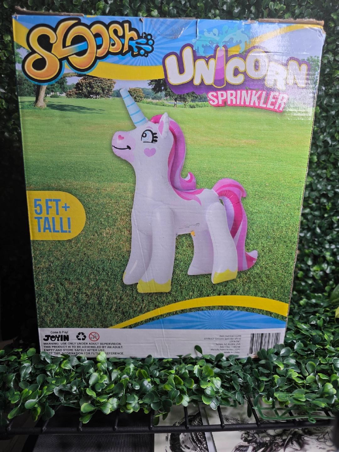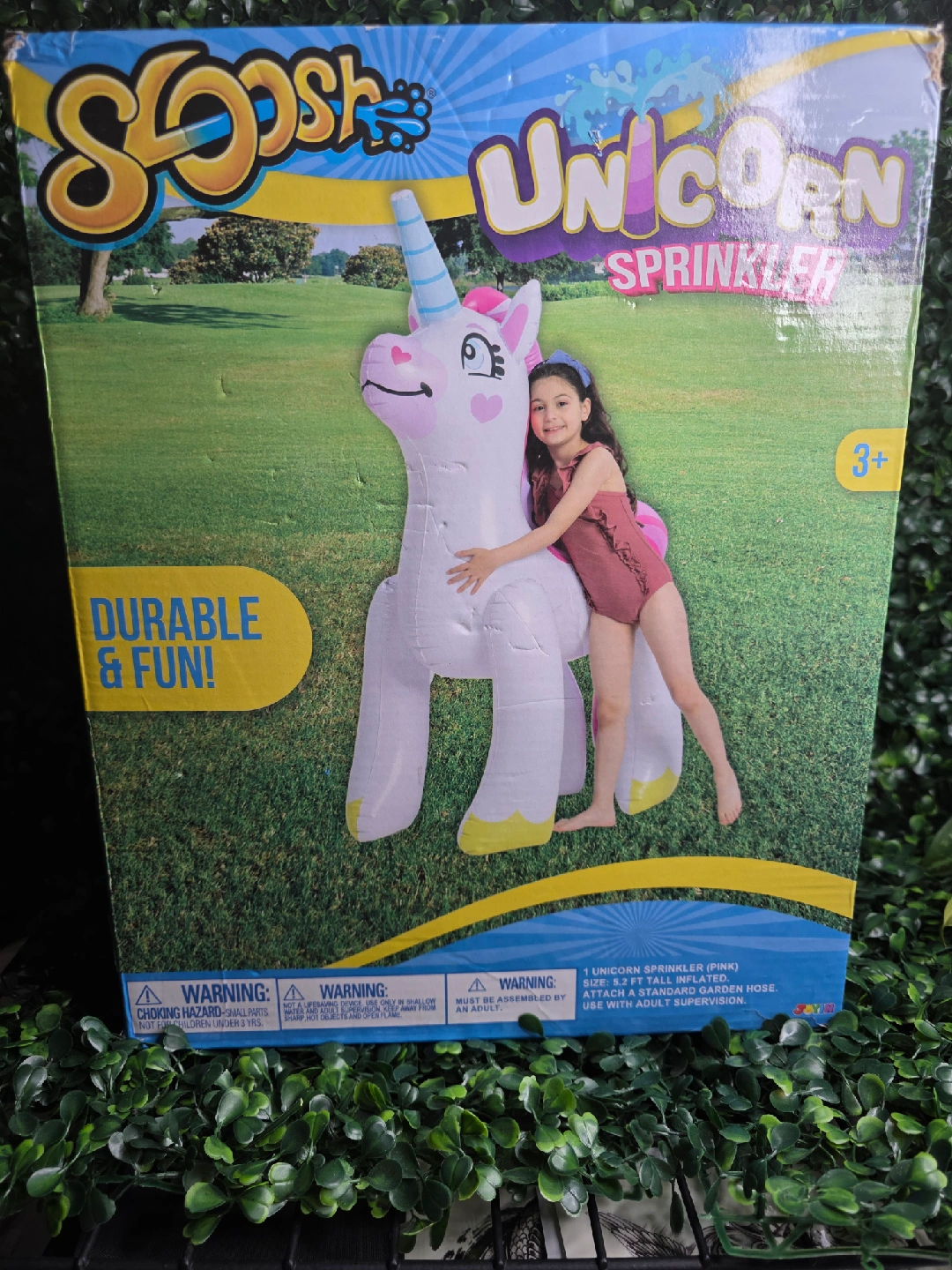 This is a Sloosh Unicorn Sprinkler! It's over 5 feet tall and is durable and fun. It comes with one unicorn sprinkler (pink) and a repair patch. It's designed to attach to a standard garden hose and is recommended for ages 3+ with adult supervision open box