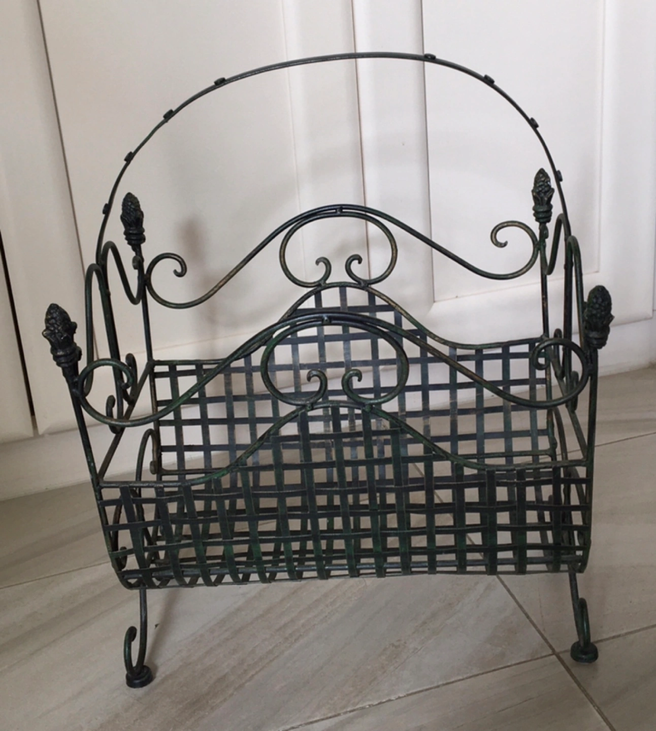 Here's a lovely vintage-style metal magazine rack, perfect for adding a touch of charm to your living room or study. It's in great shape and ready to hold your favourite magazines, books etc. The rack has a beautiful design with decorative accents, and its sturdy / solid construction ensures it will last for years to come