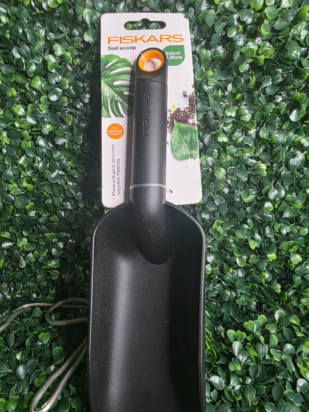 I'm selling a brand new Fiskars soil scoop! It's perfect for potting or transplanting, and has easy sides and a flat bottom for filling small spaces. It's made with post-consumer recycled plastic