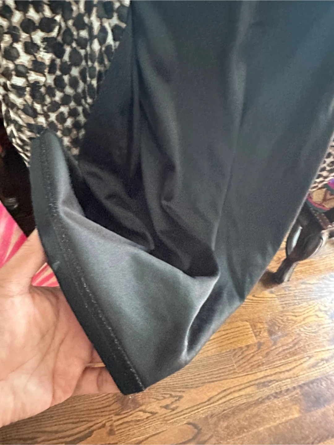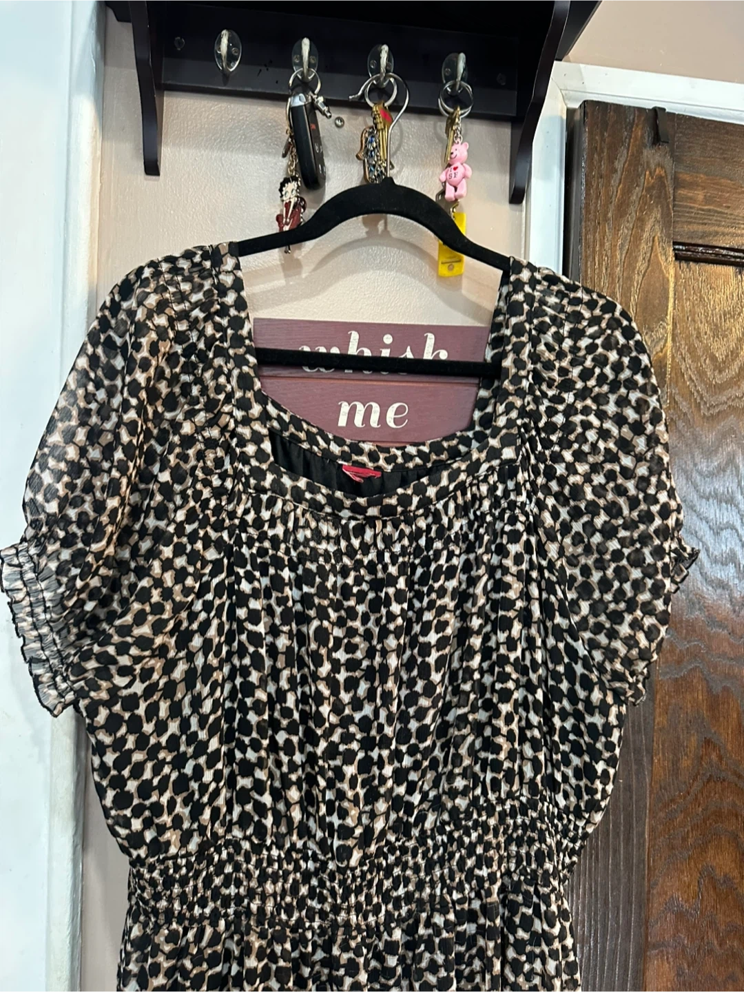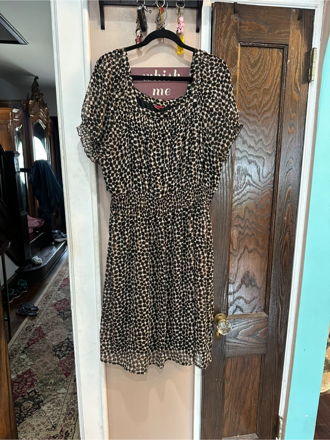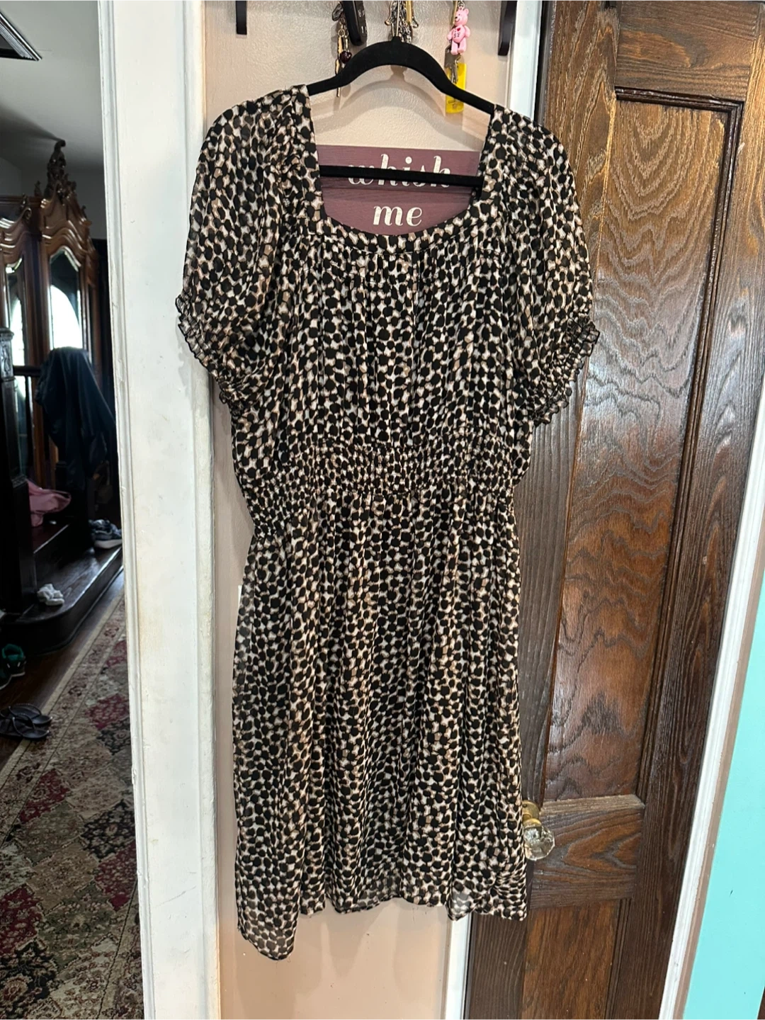 21This dress features a spotted print design. It appears to be made of a lightweight material, perfect for warmer weather. The dress has a square neckline and short sleeves with elastic at the waist.