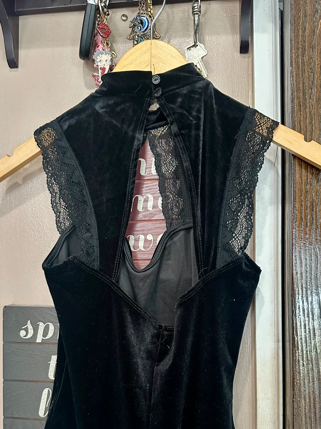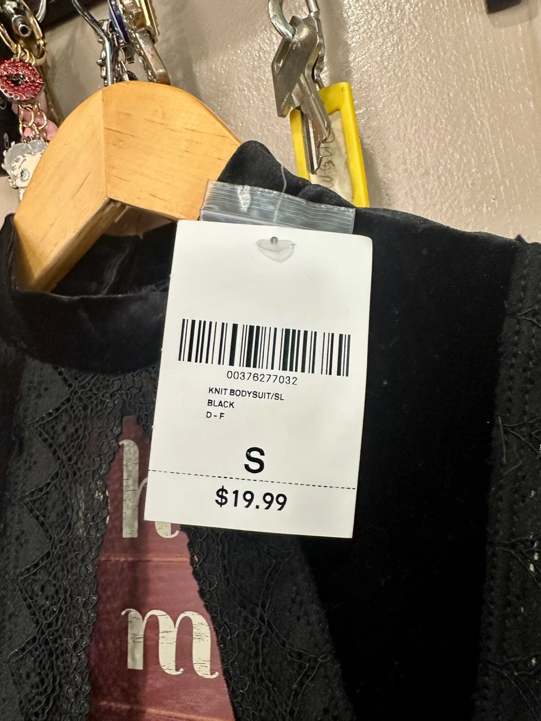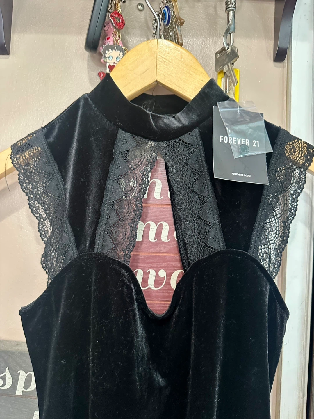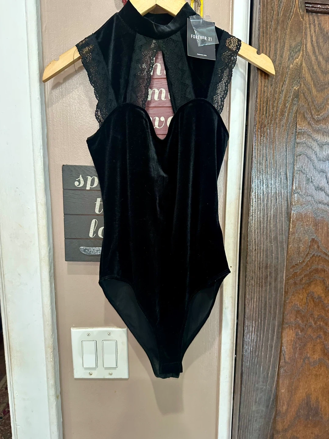 Here's a cute black knit bodysuit from Forever 21! It's a size small and features a unique design with lace detailing. It was originally bought for $19.99