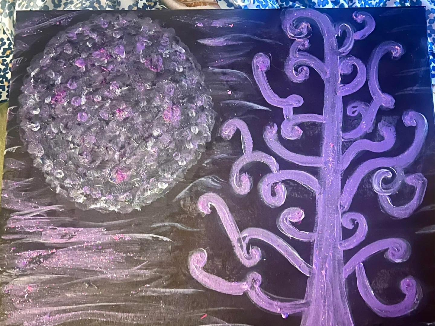 This is a painting of a moon and a tree. It's a unique piece and would look great in any home Original Amateur painting- unframed canvas