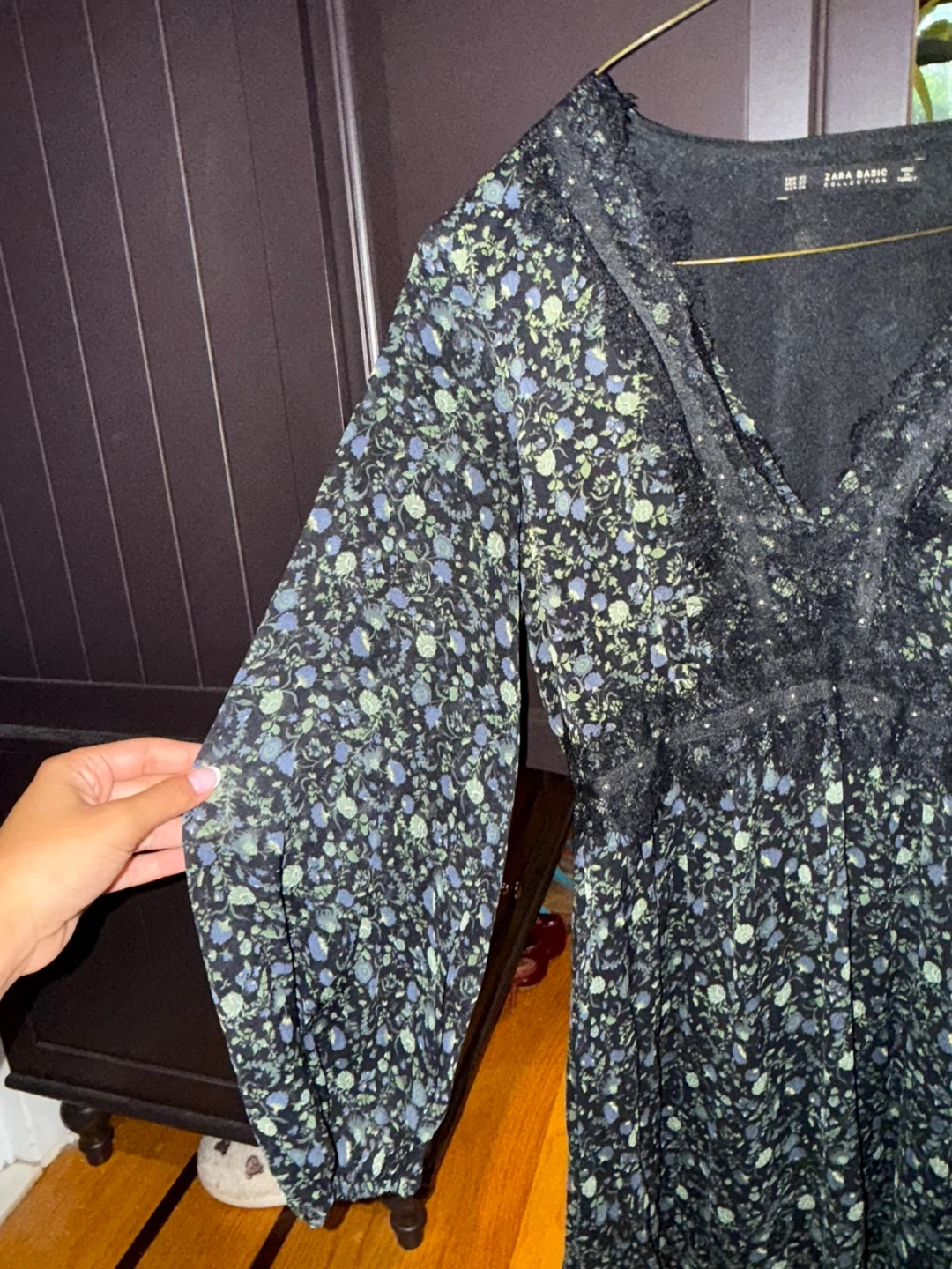 Selling a Zara floral print mini dress! It's a size Xsmall and features a flattering V-neck with lace detailing. The dress has long sleeves and a cinched waist for a comfortable fit. Perfect for a casual or dressed-up look!