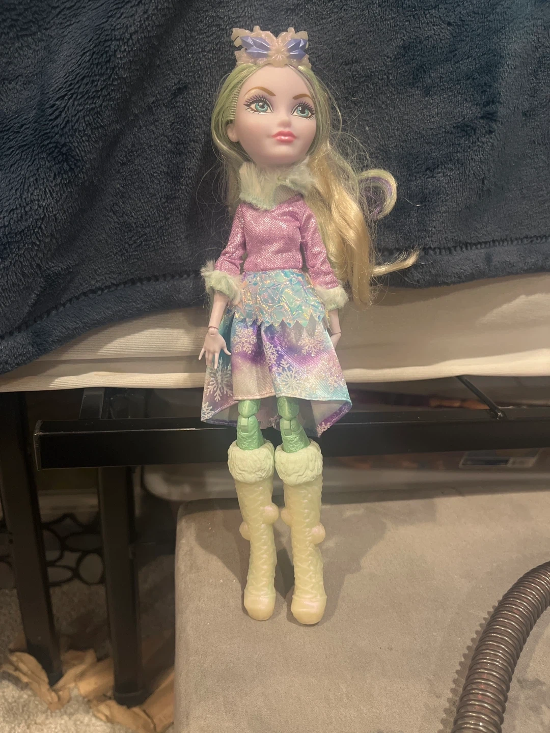 Selling an Ever After High doll from the Crystal Winter series! She has blonde hair with green streaks and is wearing a winter-themed outfit.