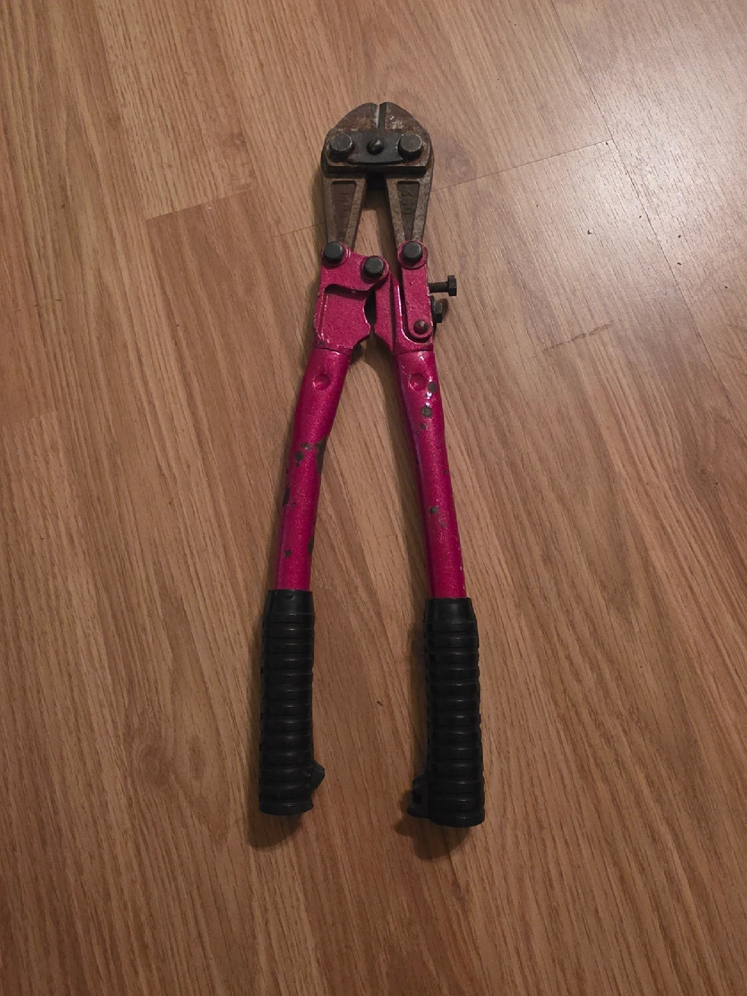Selling a pair of bolt cutters with pink handles and black grips. They show signs of use, but are still functional.