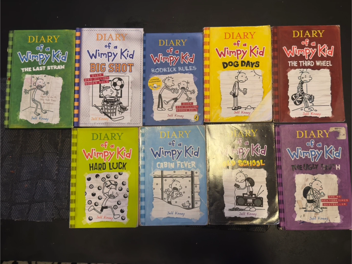 Selling a set of Diary of a Wimpy Kid books by Jeff Kinney. Includes The Last Straw, Big Shot, Rodrick Rules, Dog Days, The Third Wheel, Hard Luck, Cabin Fever, Old School, and The Ugly Truth. Perfect for young readers!