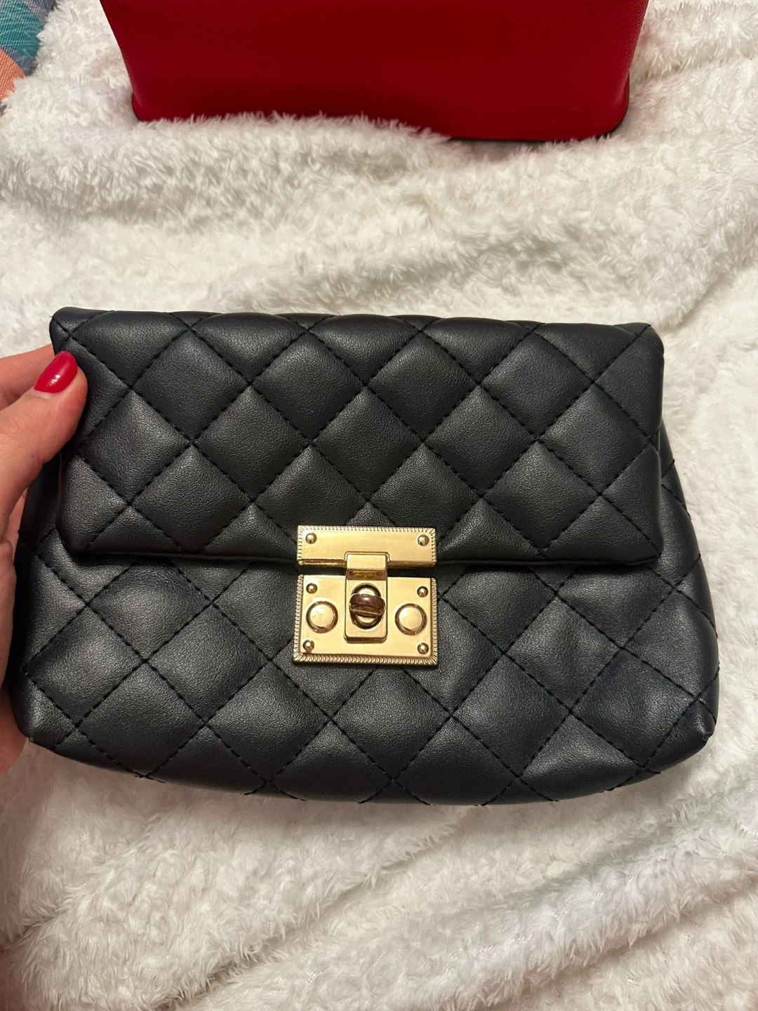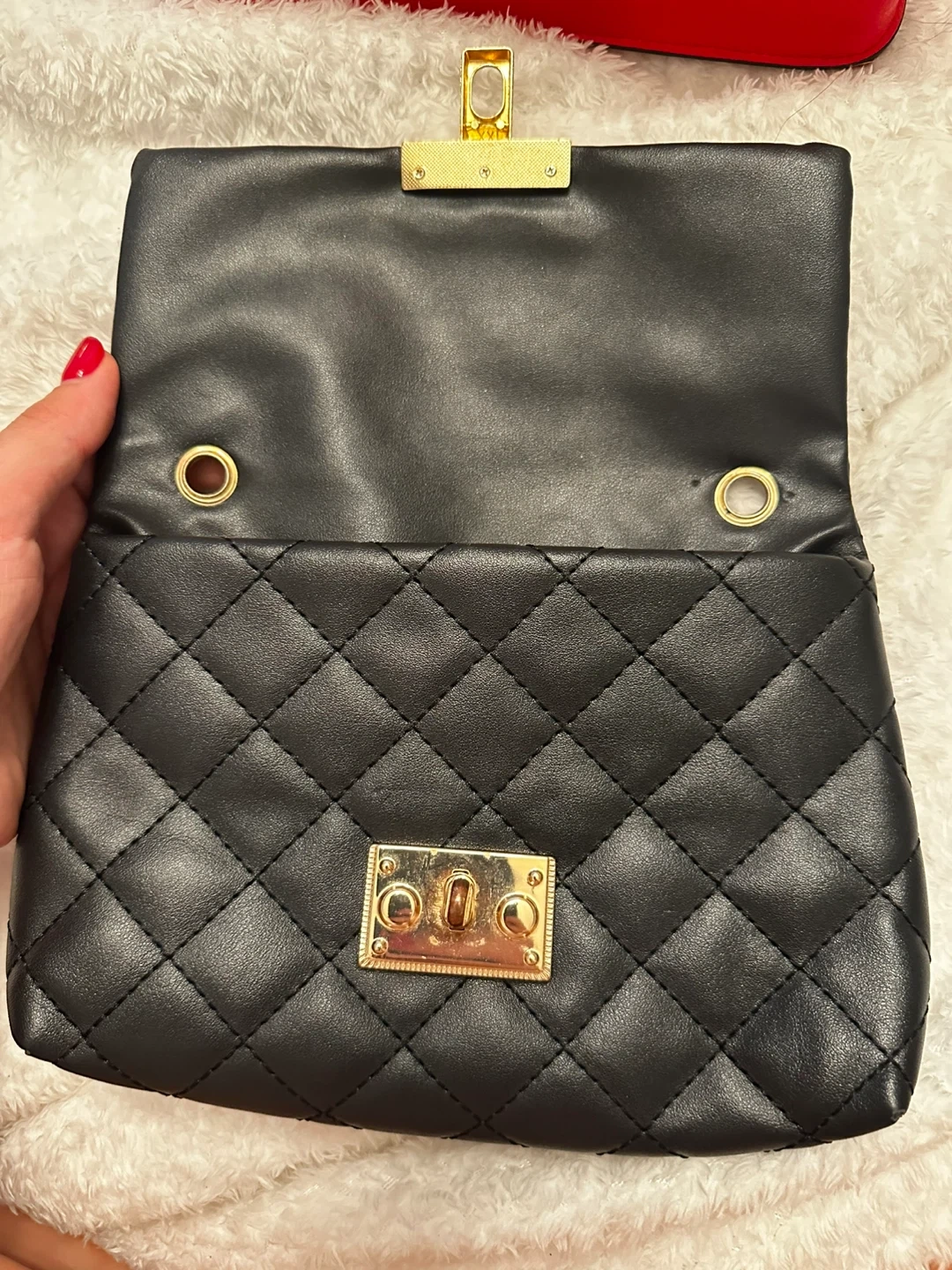 a cute black quilted crossbody bag! It's in great condition and perfect for everyday use or a night out. The bag features a classic quilted design with gold-tone hardware. It's a stylish and versatile accessory to complete any outfit(needs a chain)