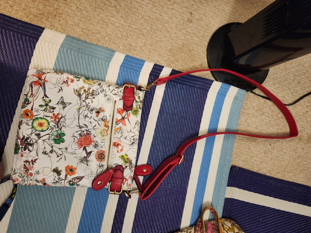 I have a cute floral shoulder bag for sale! It has a white background with a colorful floral print and a red shoulder strap. It's in great condition and ready for a new home