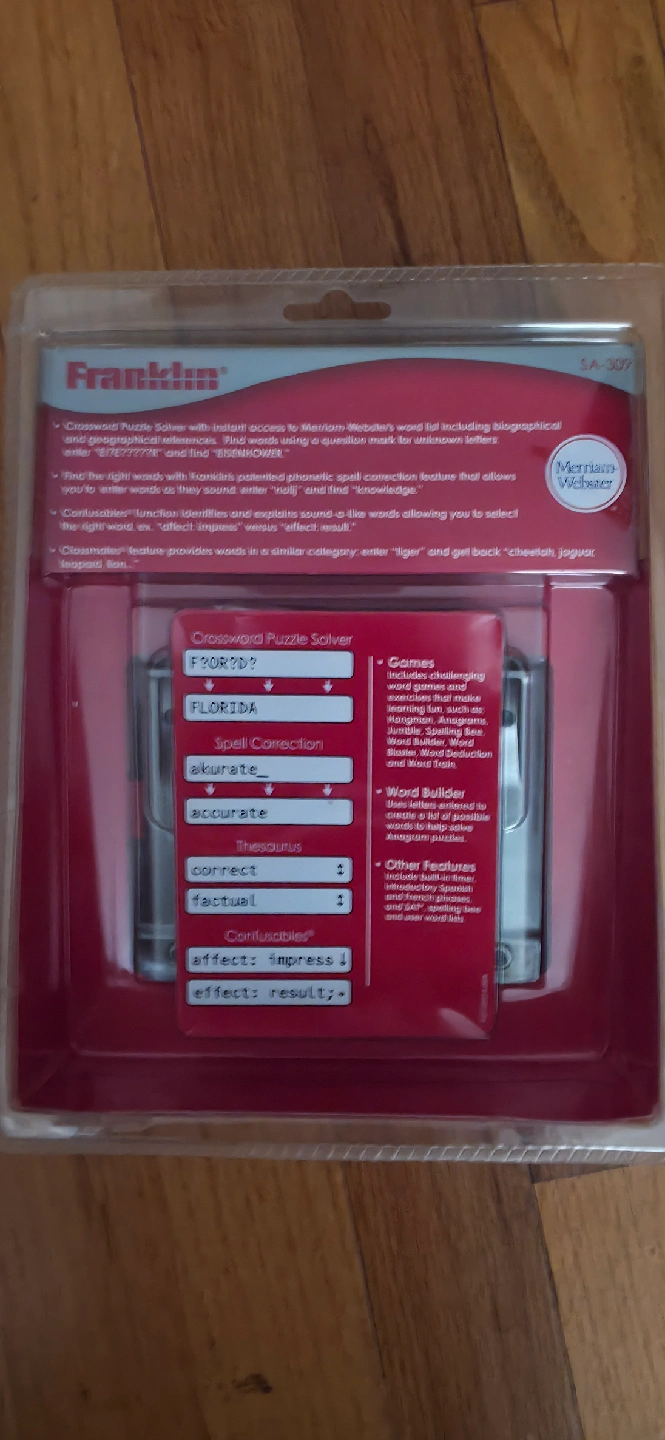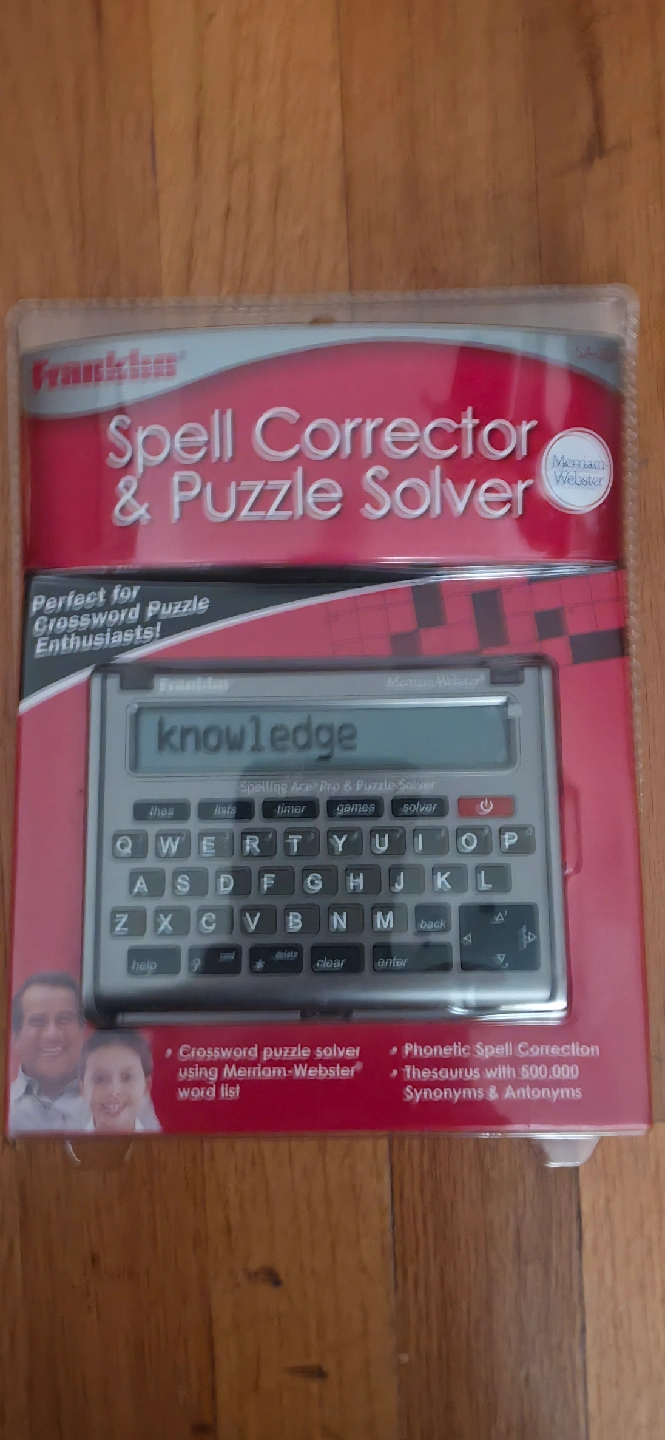 This is a Franklin Spell Corrector & Puzzle Solver. It's perfect for crossword puzzle enthusiasts! It has a Crossword puzzle solver using Merriam-Webster word list and a phonetic spell correction thesaurus with 500,000 synonyms & antonyms