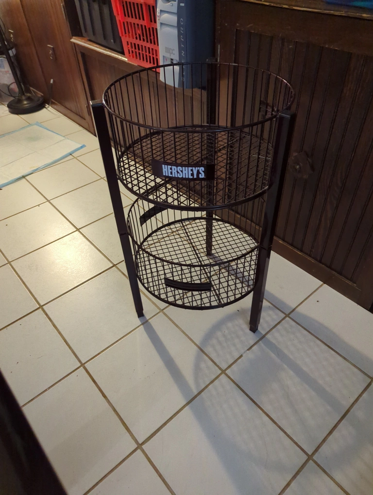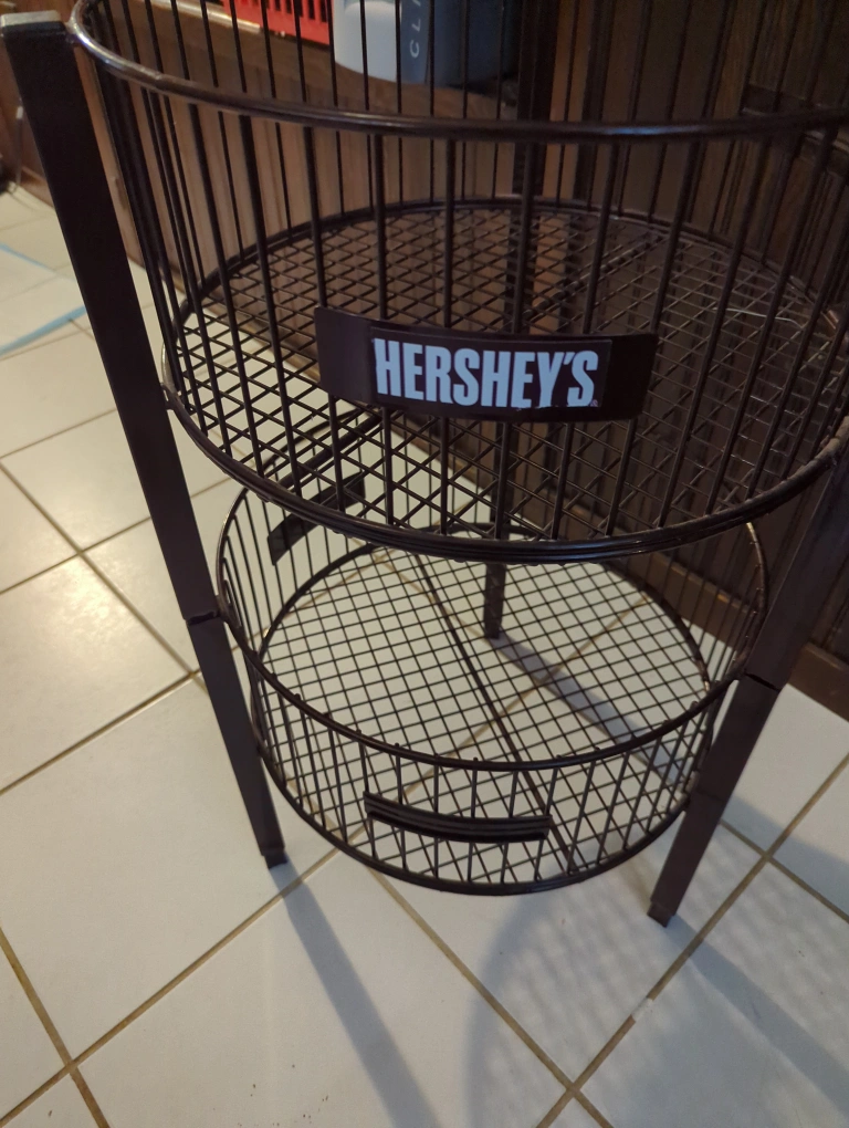 Here's a Hershey's branded 2-tier metal basket stand! It's perfect for storing items in a stylish way. This stand is great for organizing your space.